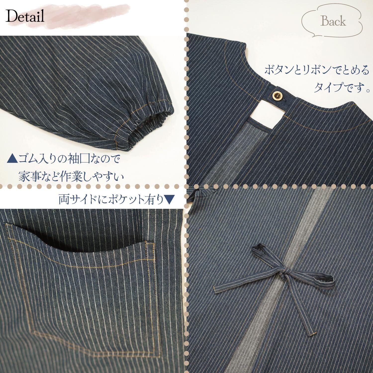 【スタンダードなデザイン】背中のボタンとリボンでとめるタイプです。ゴム入りの袖口なので家事などの作業もしやすい首元すっきりラウンドネック。両サイドに便利なポケット付きです。