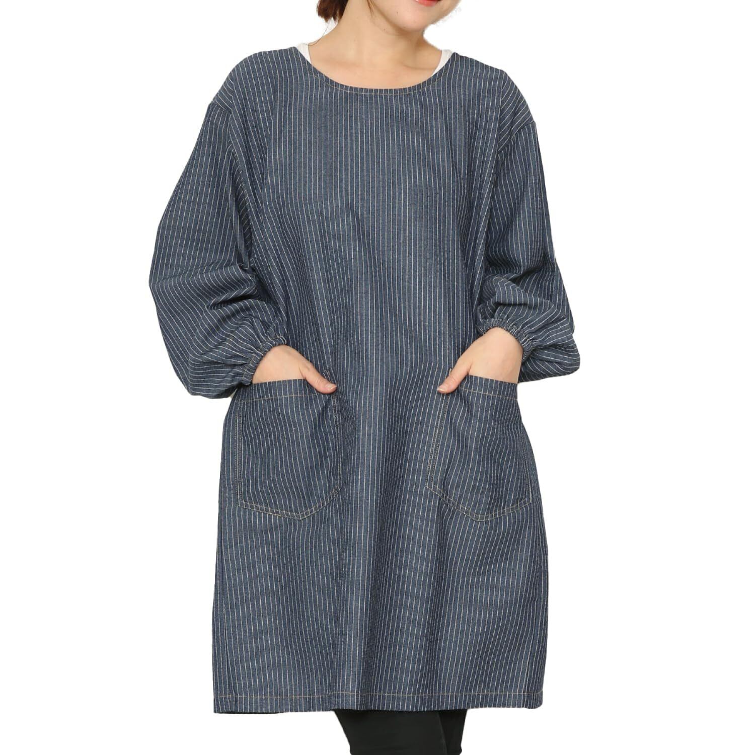 [ON NISHIKI] 割烹着 デニム レディース (無地/ヒッコリー) デニム割烹着 おしゃれ 可愛い ゆったり ロング丈 後ろ開き スモック かっぽう着 袖付きエプロン ポケット付き