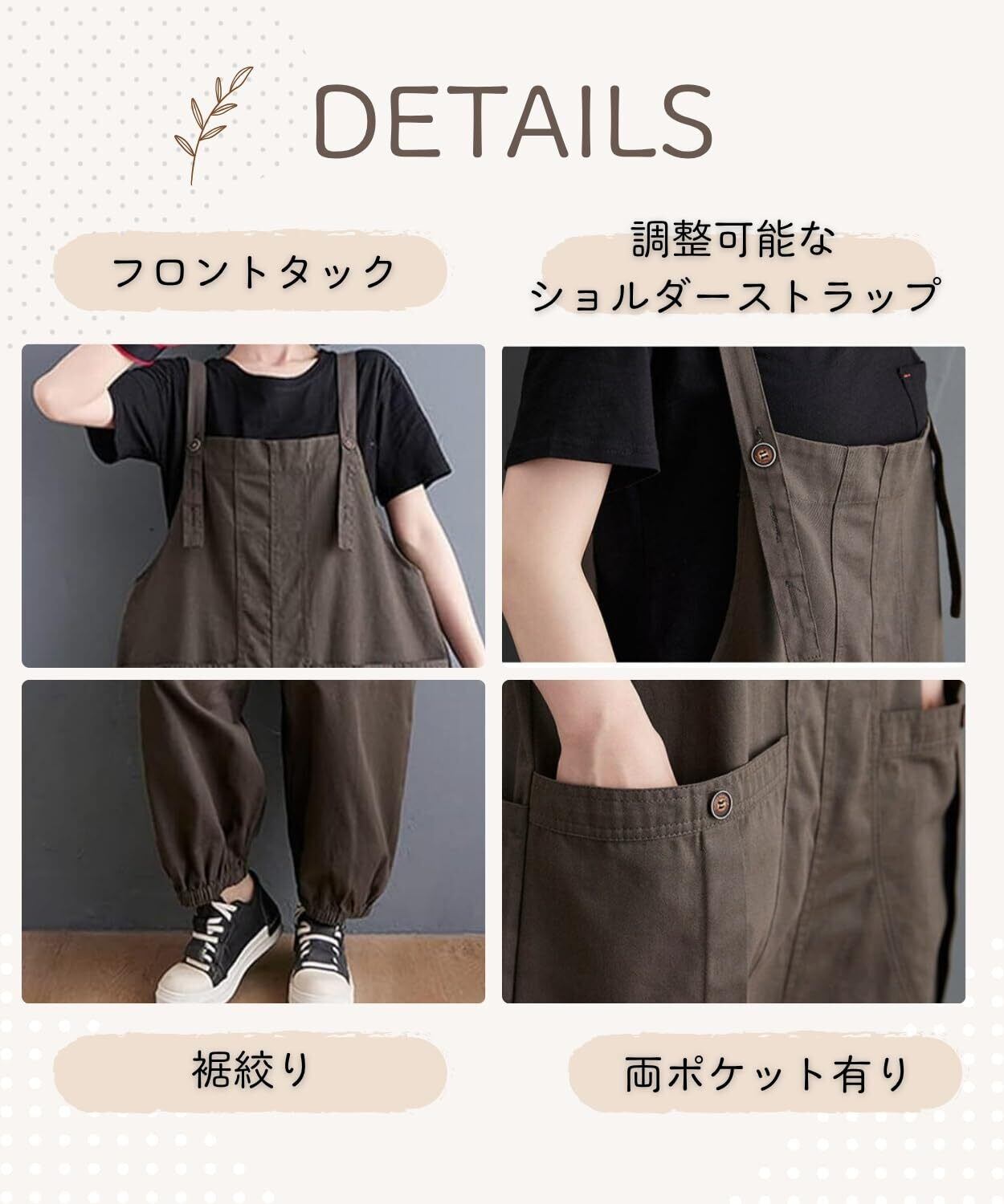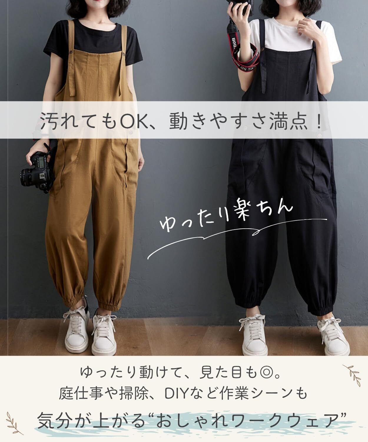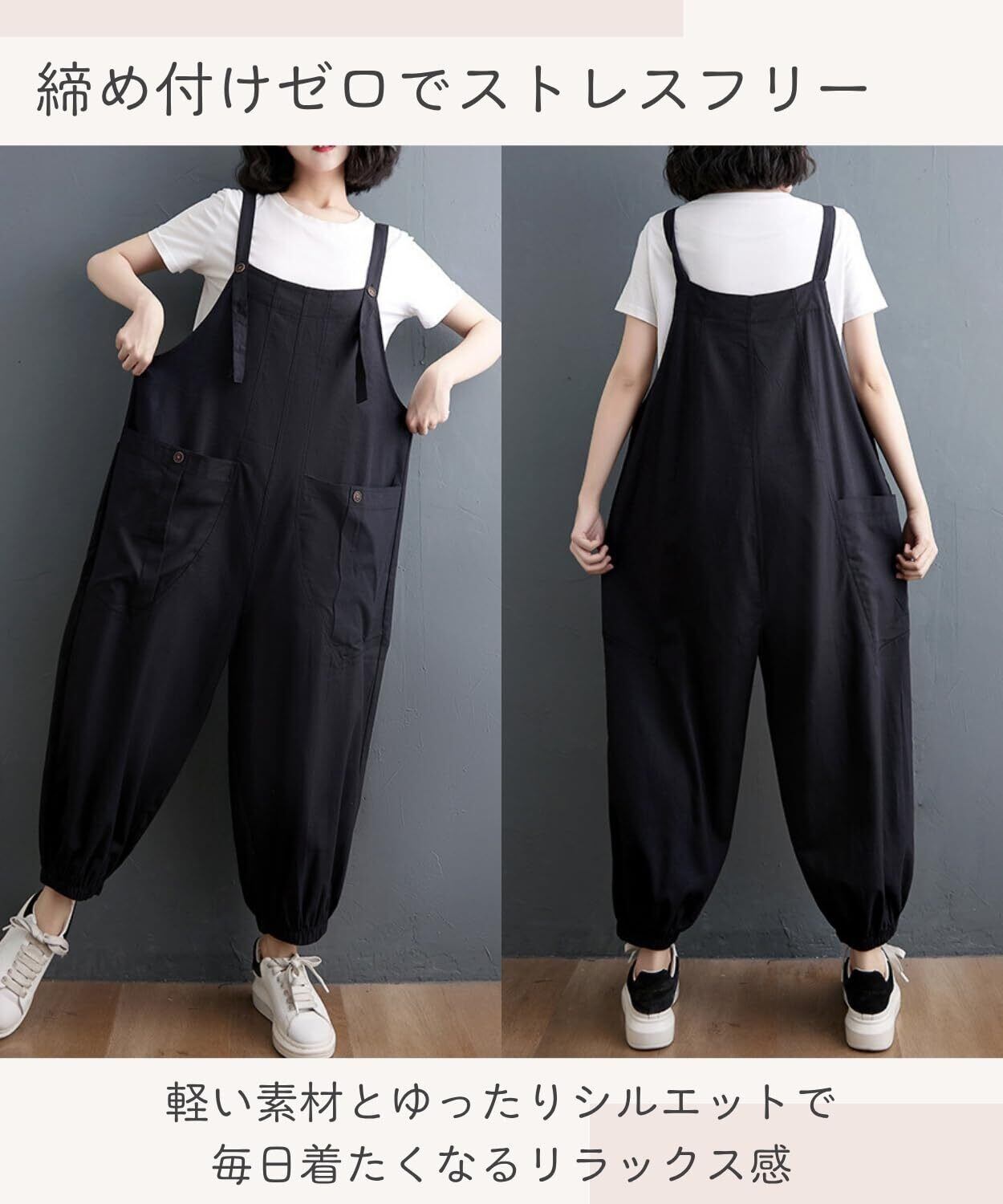 【ゆったりシルエットで体型カバーもバッチリ!】 オーバーサイズのデザインで、体型を気にせずリラックスできます。裾絞りのワイドパンツスタイルでこなれ感たっぷり!体型カバーしながらおしゃれができる優秀アイテムです。胴回りがかなりゆったりしたデザインなのでマタニティー用としても着用いただけます。