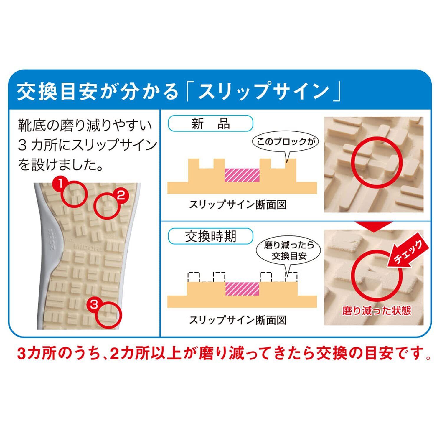 ●耐滑底(最高レベル)+スリップサイン:最高レベルの耐滑性。油や水などで特に滑りやすい床面での作業に適した滑りにくい靴です。靴底には目視でわかる3ヵ所のサイン付きです。