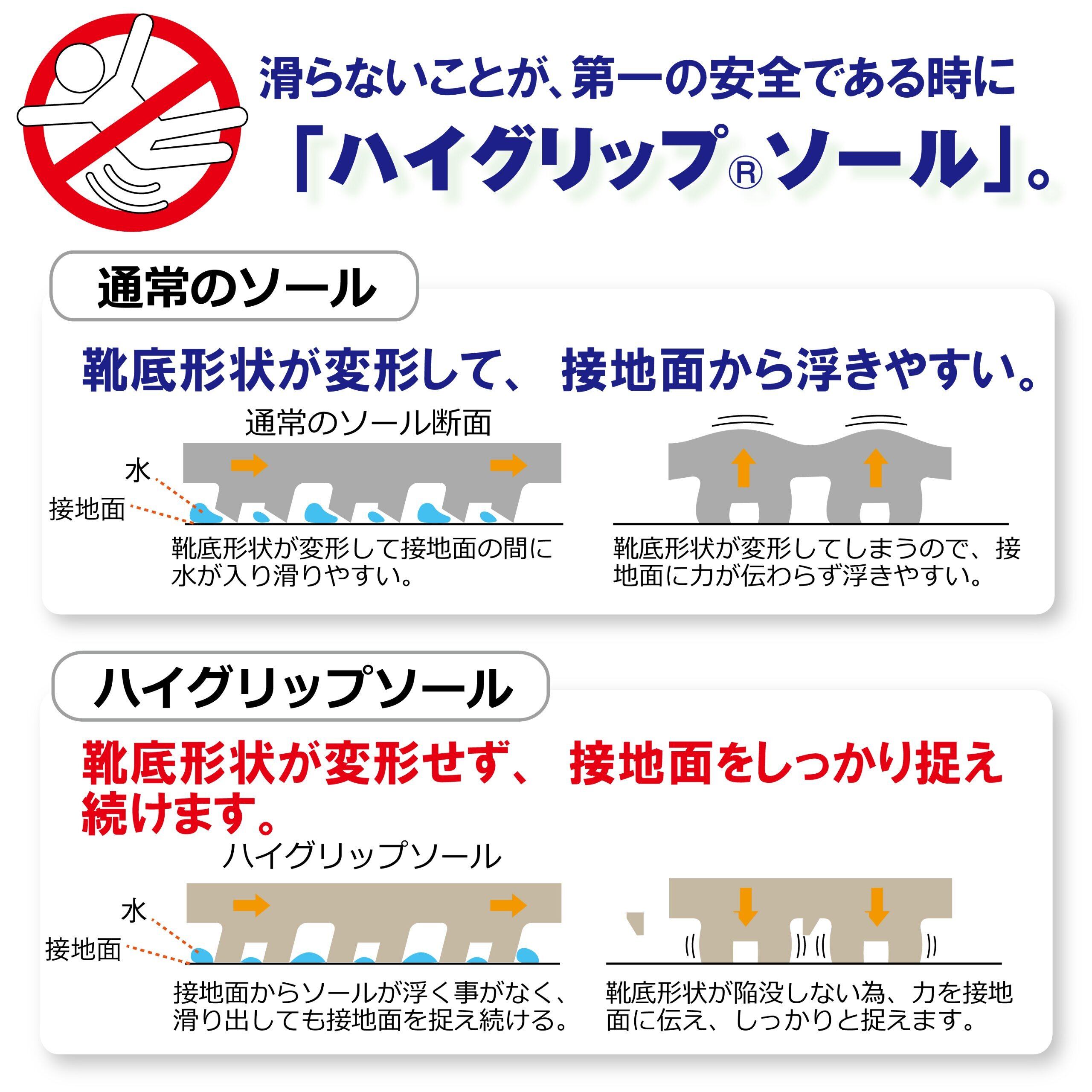 【ハイグリップソール】特殊配合の合成ゴムと滑りにくい意匠で、油や水に対しても防滑性を向上。安全靴・作業靴技術指針で定められた耐滑性能の最高区分5を実現しています。