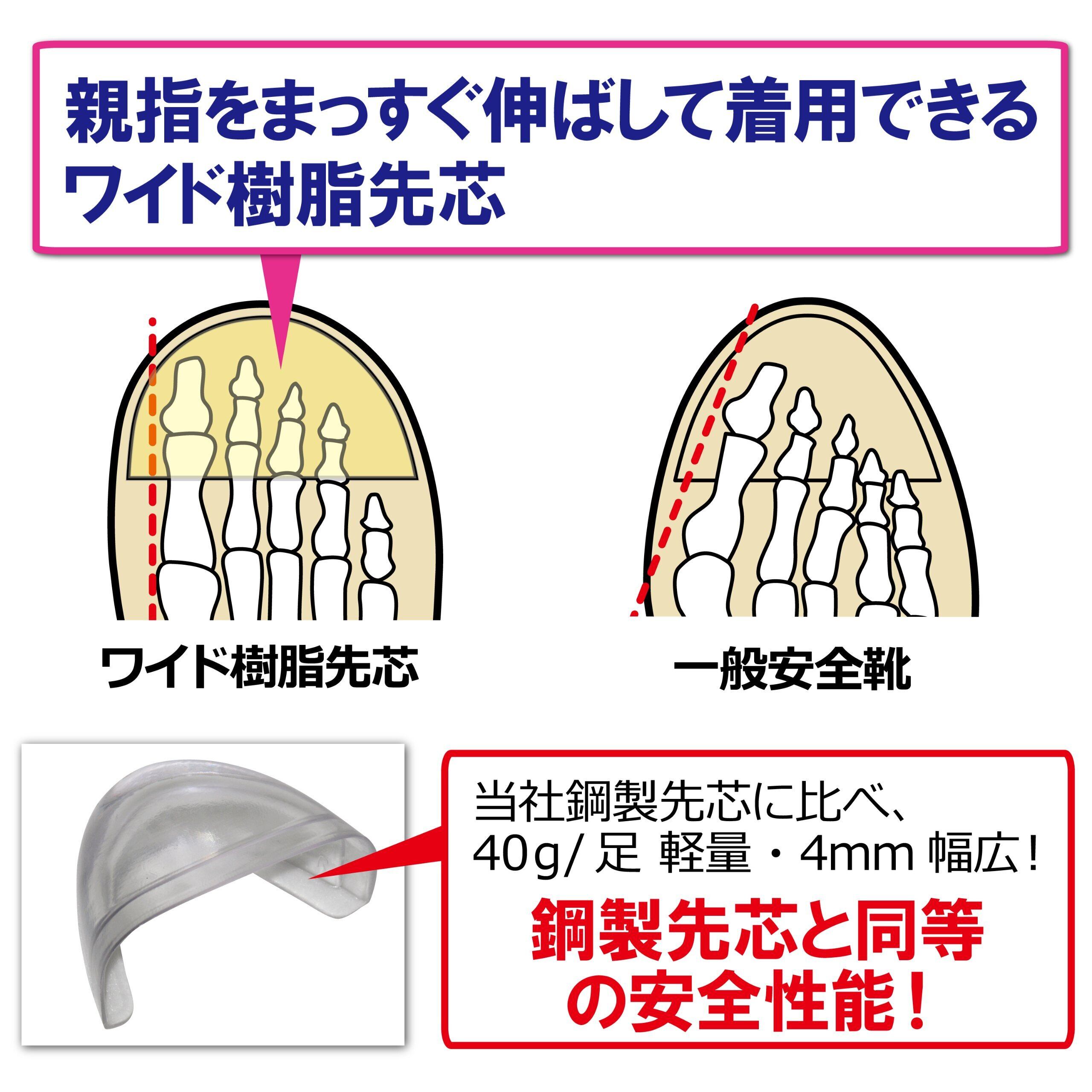 【ワイド樹脂先芯】内振り靴型とワイド樹脂先芯の採用により、指先への圧迫を最小限に抑えています。樹脂先芯は軽量ながらも鋼製先芯と同じ安全性を持っています。