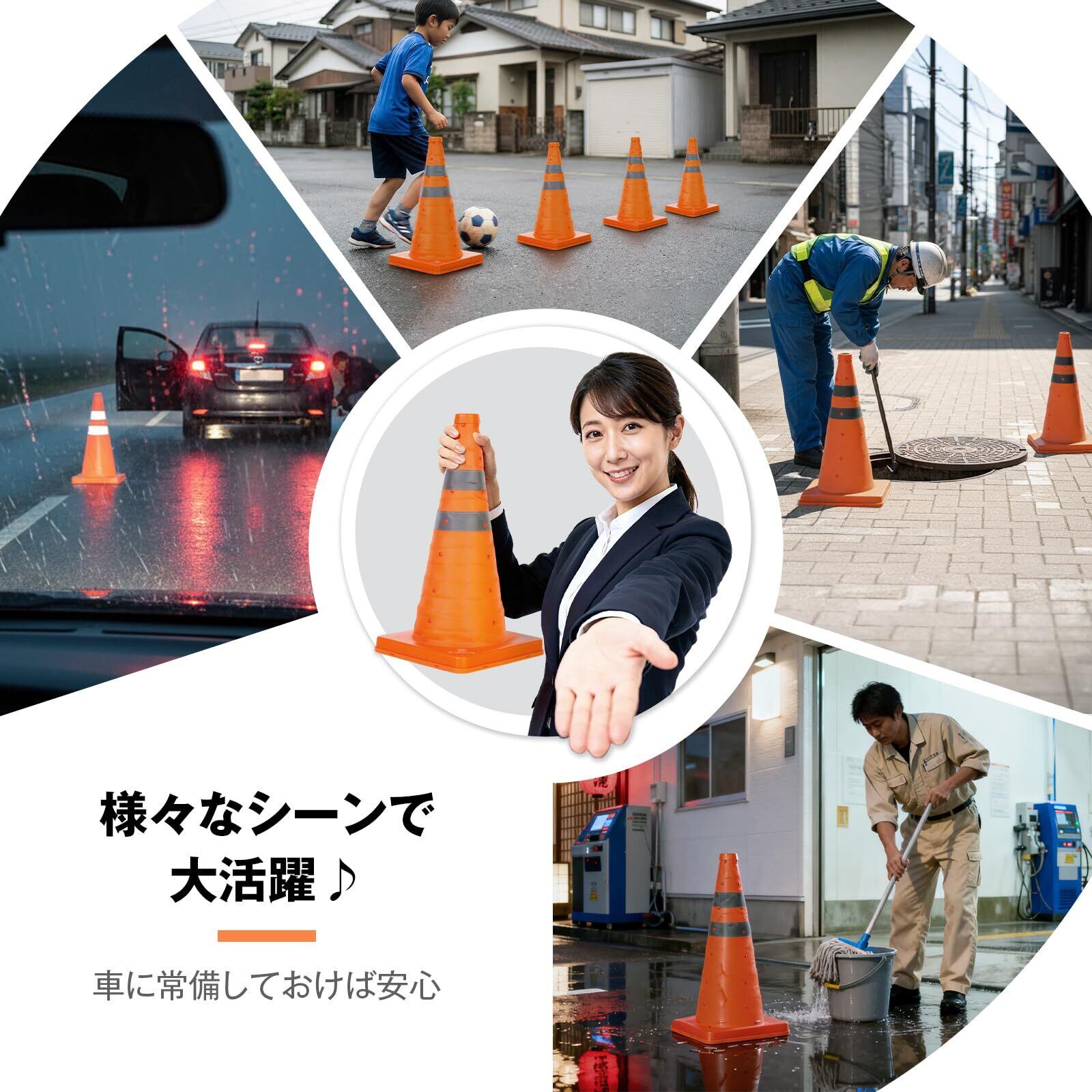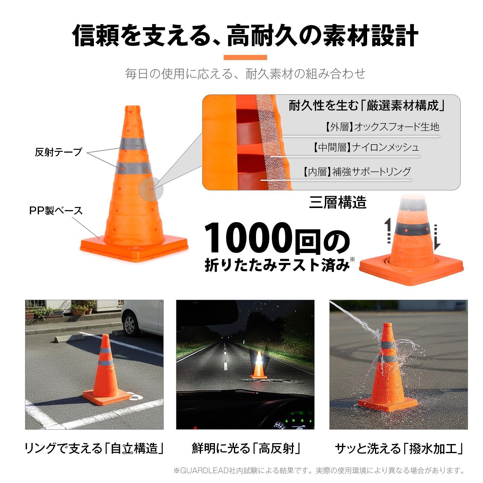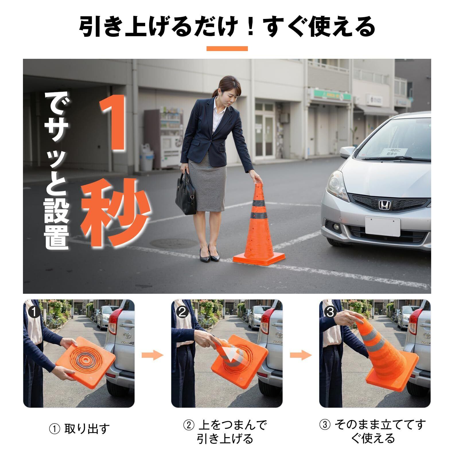 【反射率の高い視認性】反射コーン本体色は日中の視認性に優れる蛍光オレンジ色。反射テープ付なので、を問わずどの角度からでも表示されます、夜間の視認性も確保できます、緊急停車時などの使用も可能!