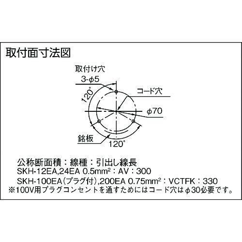 定格電圧 AC100V 電流 0.065A 閃光数 170回/分 質量 0.6kg コンセントプラグ付きケーブル 公称断面積 0.75mm2 線種 VCTFK 引出し線長 330mm