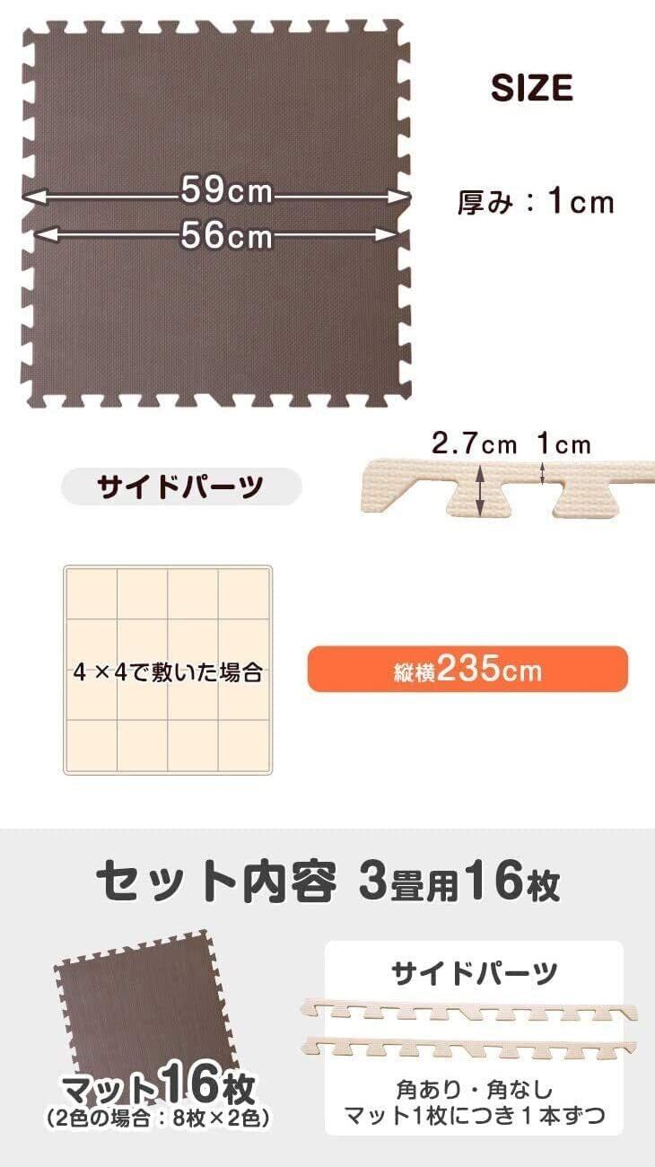 【追加購入をご検討中のお客様へ】※PE素材の特性上、使用するうちに負荷がかかる部分に多少のへたりが生じます。そのため、既に使用しているマットに新しいマットを繋げて使用する際、上手く繋がらない場合がございます。予めご了承ください。※2020年6月22日よりマットサイズを59cmへ変更しました。この日以前にお買い上げいただいた商品とは接続できません。また色味も若干変わっているため、追加購入の際はご注意いただきますようお願いいたします。2019年1月10日に素材をEVAからPEに変更しました。
