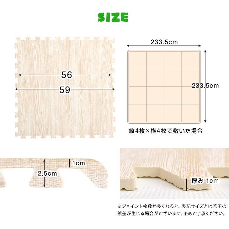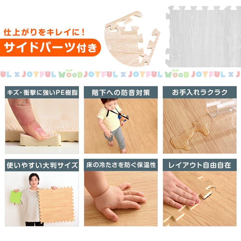 商品の仕様上、ジョイント部分(サイドパーツ含む)の木目の柄は合わない場合がございます。 ジョイントマットに使用する樹脂素材については、より安全な素材となるよう技術の向上がなされており、その過程で現在使用している素材はPEと記載を行うことが適切となりましたので、2019年1月21日にEVAからPEに表記を変更しました。日本の大手量販店でも随時、記載の変更が行われており、品質を悪化させたものではありませんのでご安心ください。 ・床材(塩化ビニル・フローリング等)によって、色移りや変色が起こる場合がございます。床とマットの間に敷物や防護シートを敷いていただくことを推奨しております。 ※2020年2月26日より商品ページでの「大判58cmタイプ」の表記を「大判59cm」に変更をしました。 実際の商品サイズに変更はございませんので、過去58cmタイプをお買い上げいただいたお客様は、そのまま接続が可能です。 ※2022年12月1日にホワイトとライトグレーの販売を終了し、ライトオークとオフホワイトの販売を開始しました。