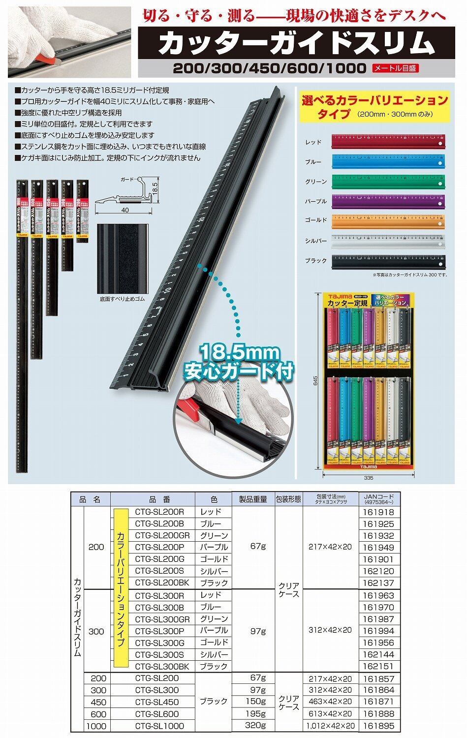 カッターから手を守る、高さ18.5ミリのガード付定規