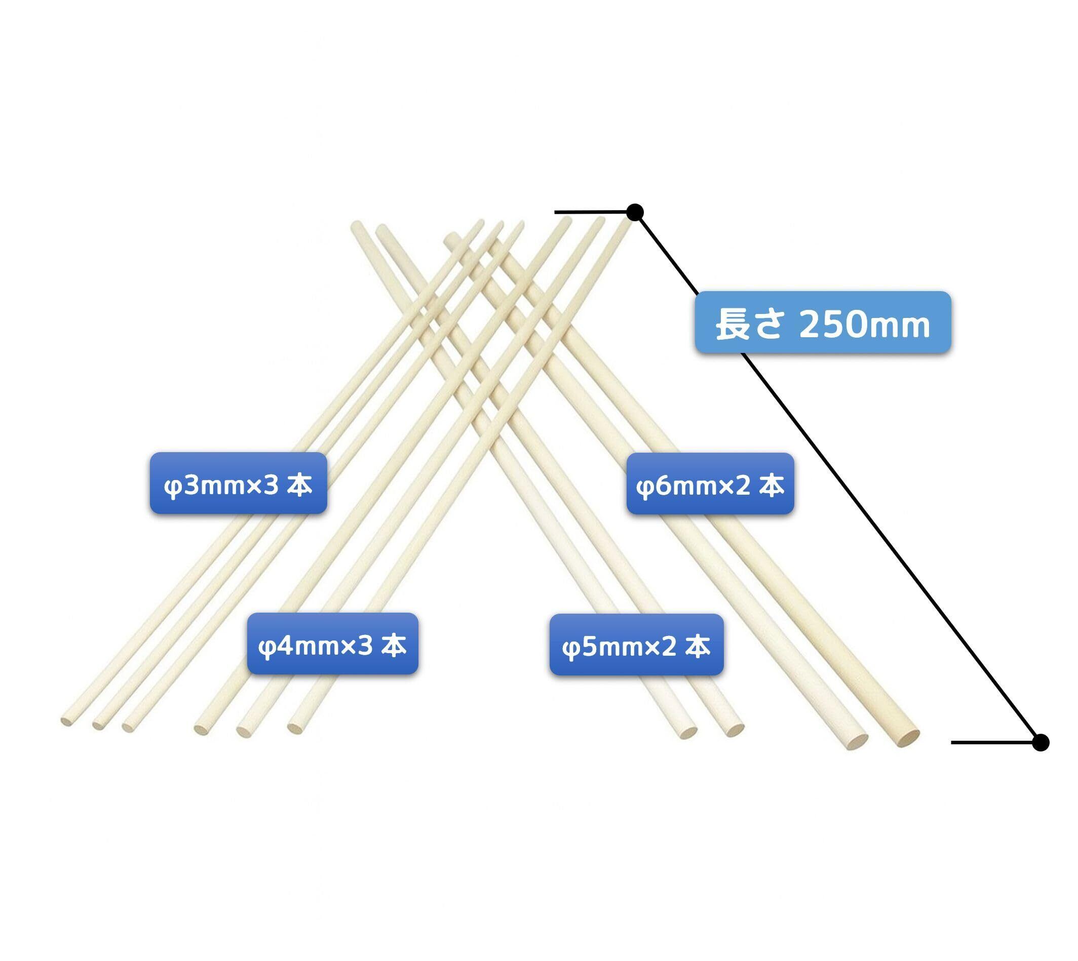 φ3mm・φ4mmは各3本、φ5mm・φ6mmは各2本、長さはすべて約250mmです。