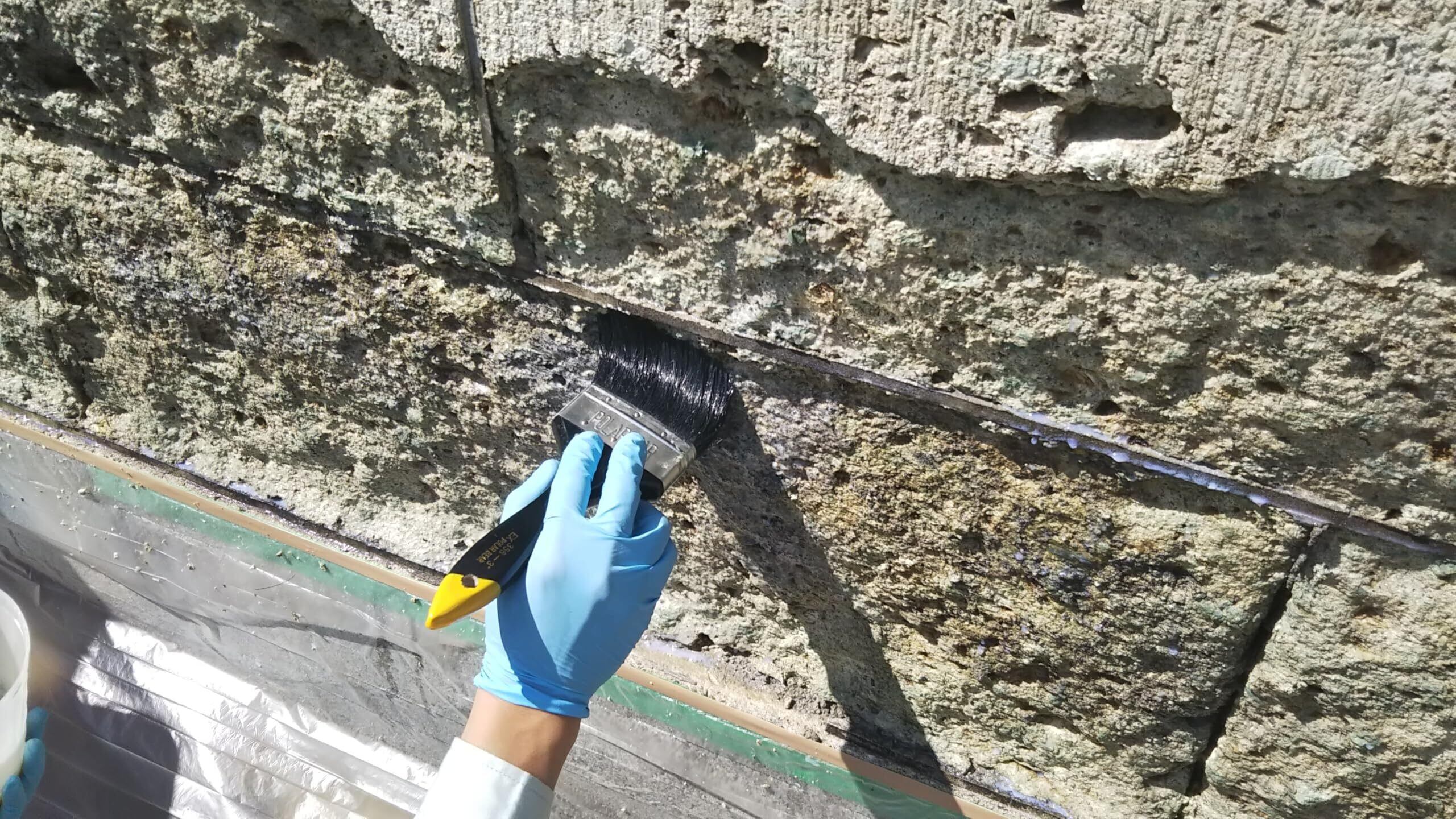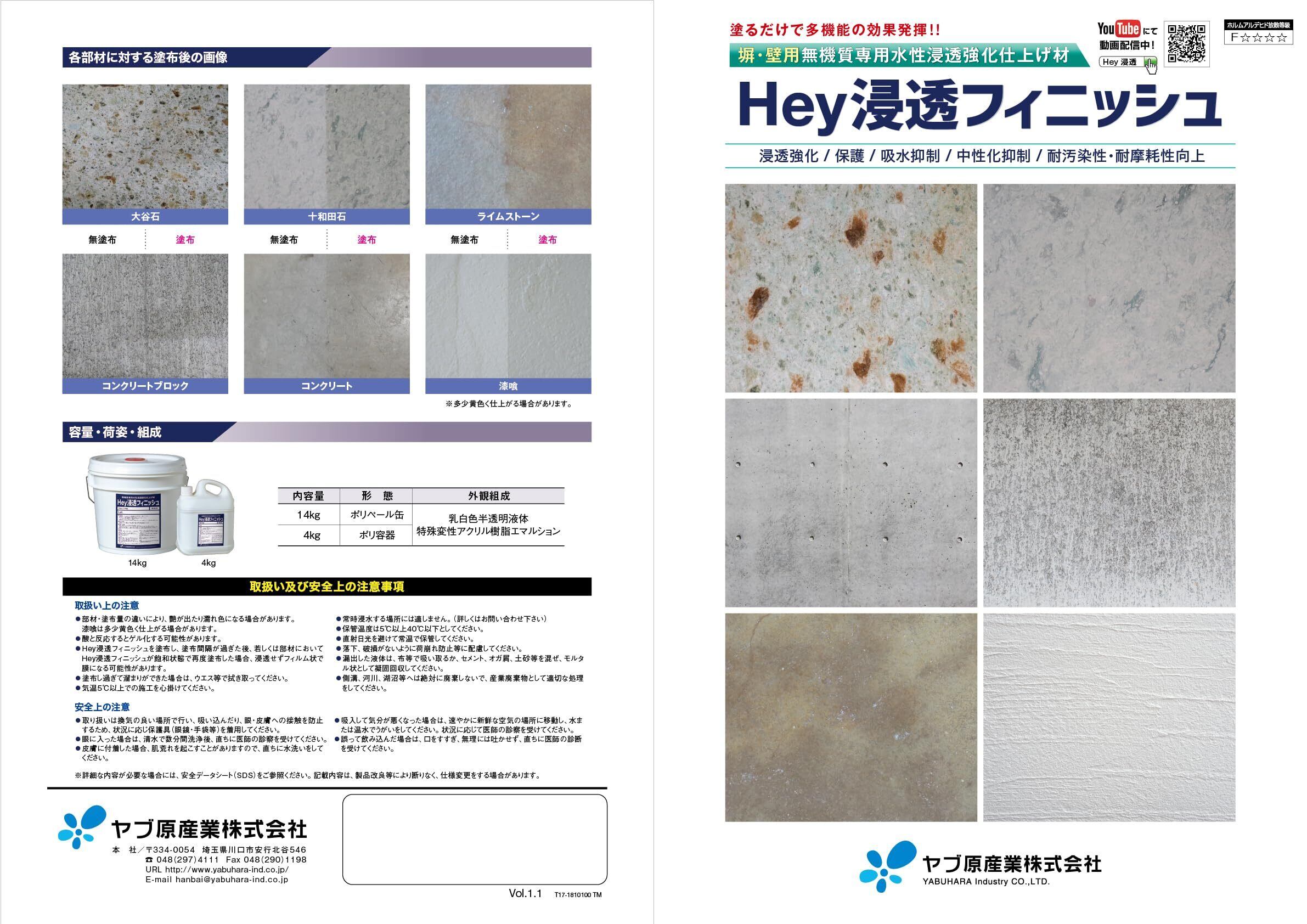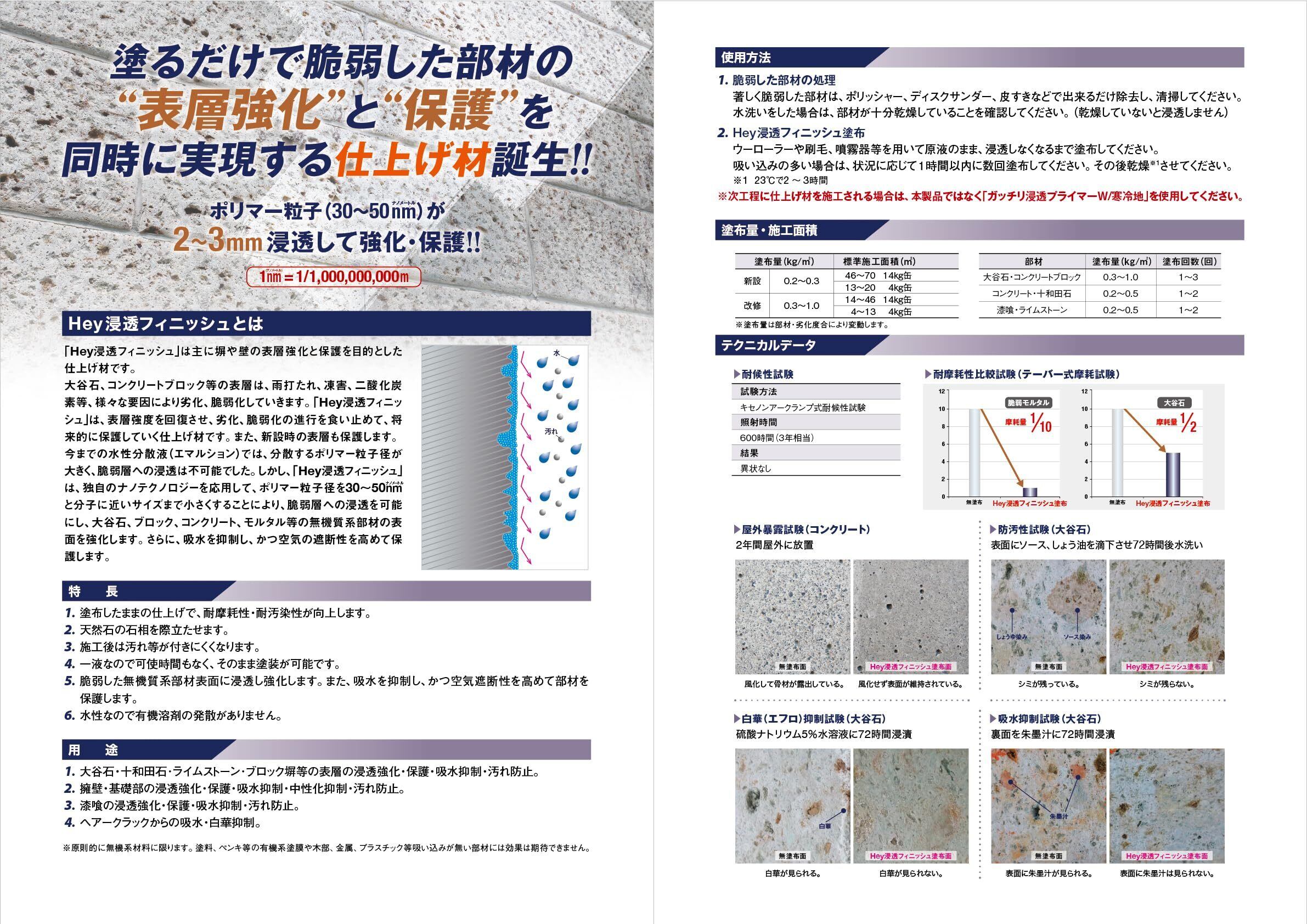 Hey浸透フィニッシュは塗るだけで脆弱した無機質系部材の表層強化と保護を同時に実現する仕上げ材です。独自のナノテノロジーを応用して、分子に近いサイズまで小さくすることにより脆弱層への浸透を可能にし、大谷石・ブロック・コンクリート・モルタル等の無機質系部材の表面保護し強化します。それ以外に吸水抑制、中性化抑制、耐汚染性・耐摩耗性向上の働きがあります。塗るだけで多機能の効果発揮。大谷石の保護・表層の浸透強化には最適な製品です。