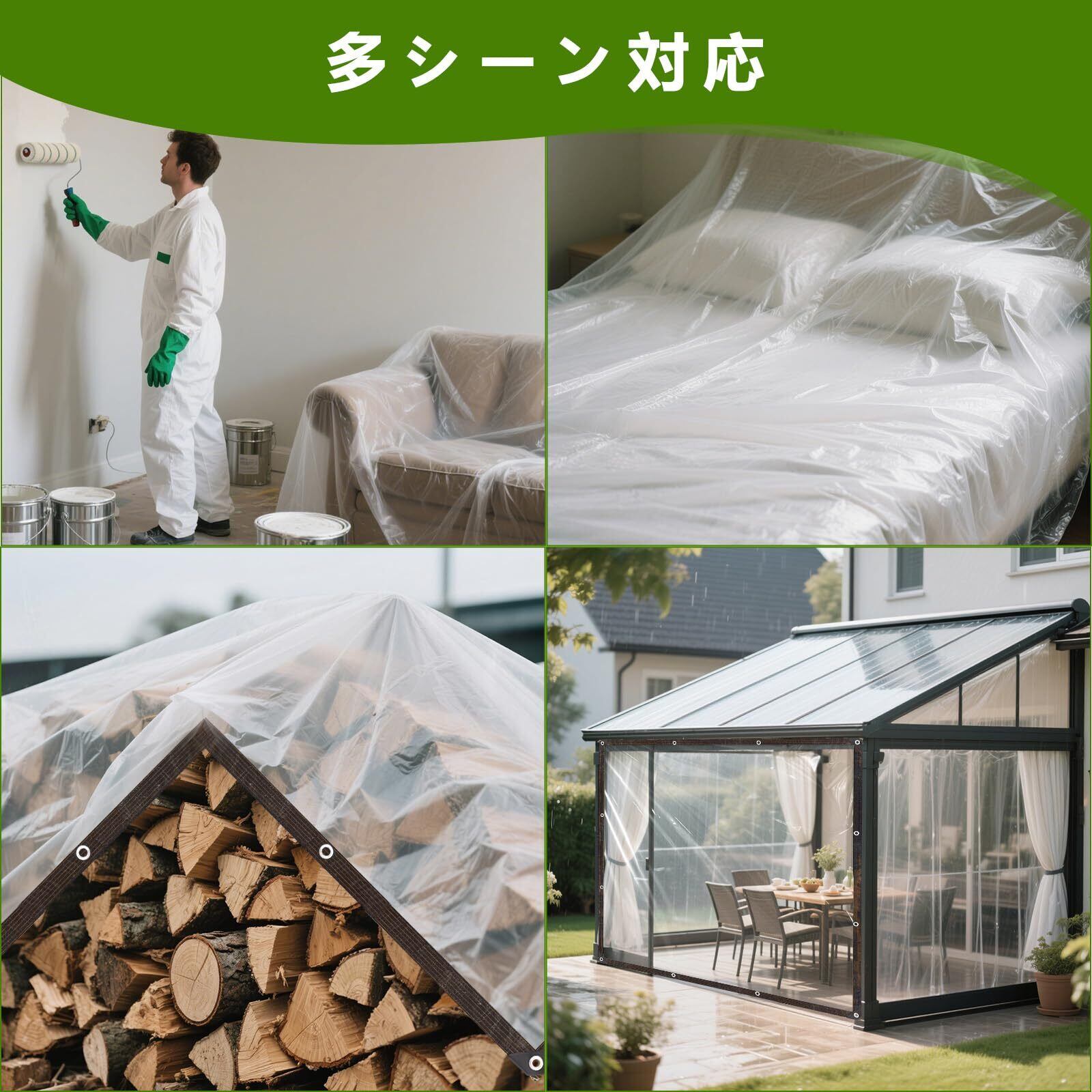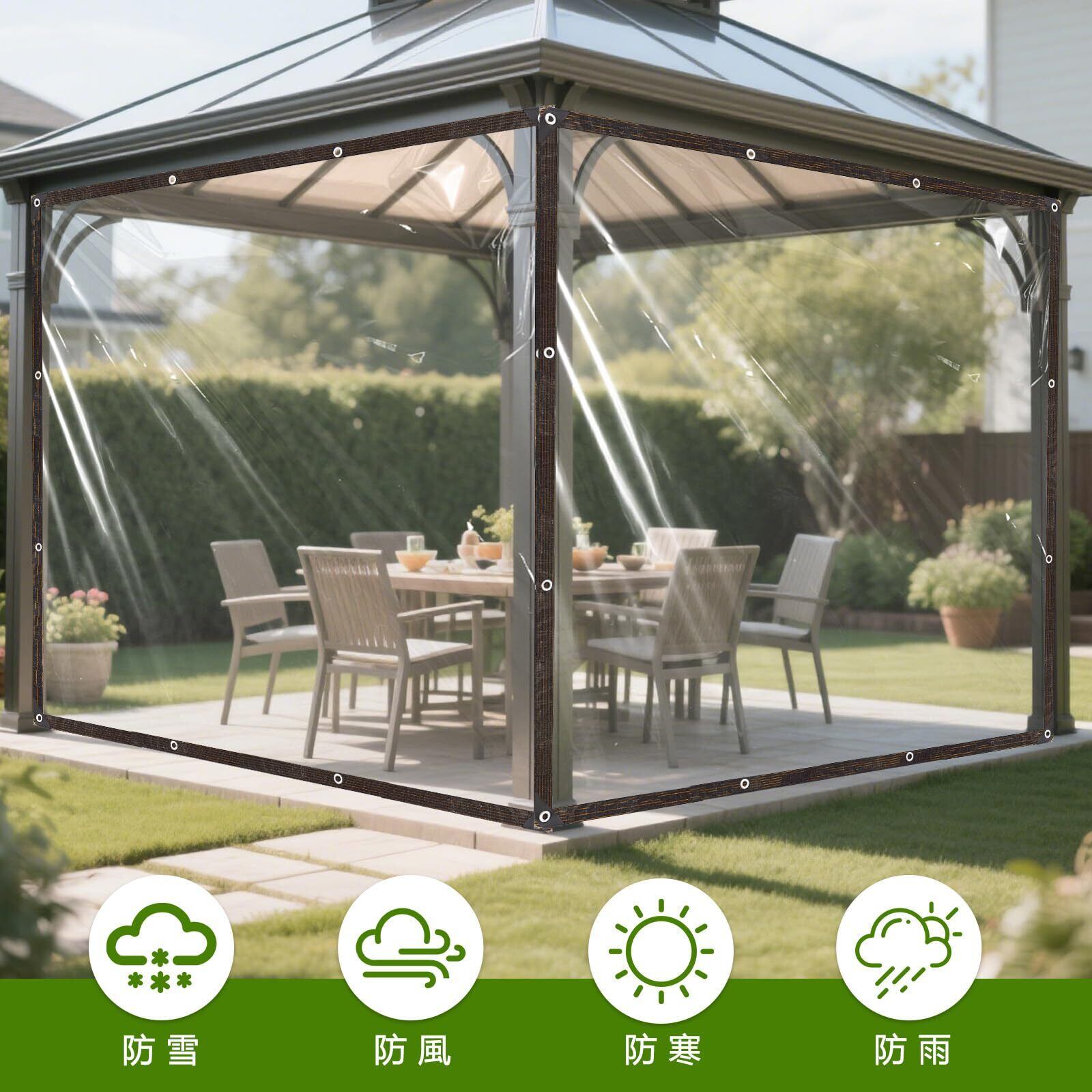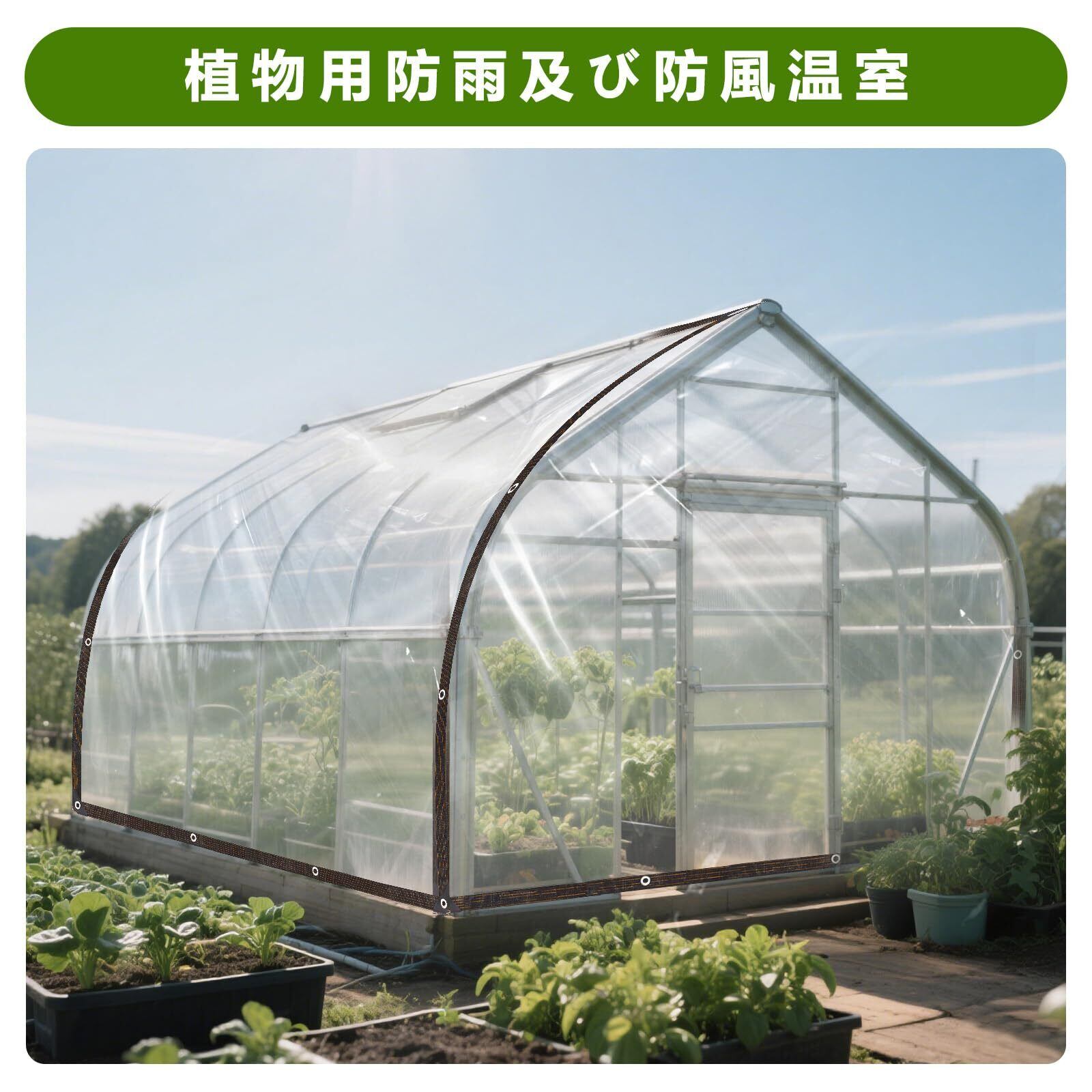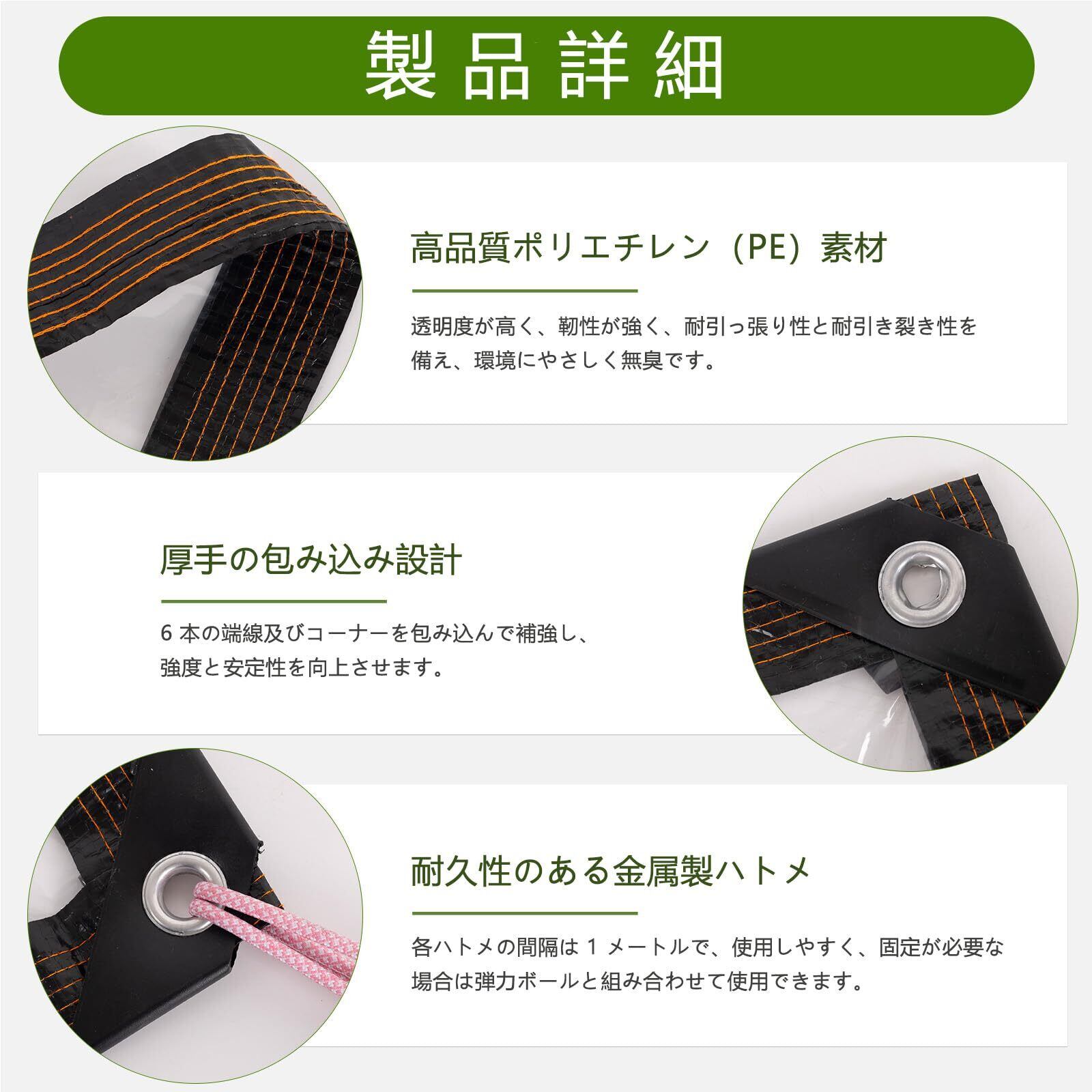 【優れた透明デザイン】全透明のデザインを採用し、防雨・防風・防雪・防塵・防寒といった主要用途を確保する同時に、優れた透光性も維持しています。被覆した後でも光線に影響を与えず、タープ越しに明確な視界を保てるだけでなく、植物もゆっくり光合成を行えます。