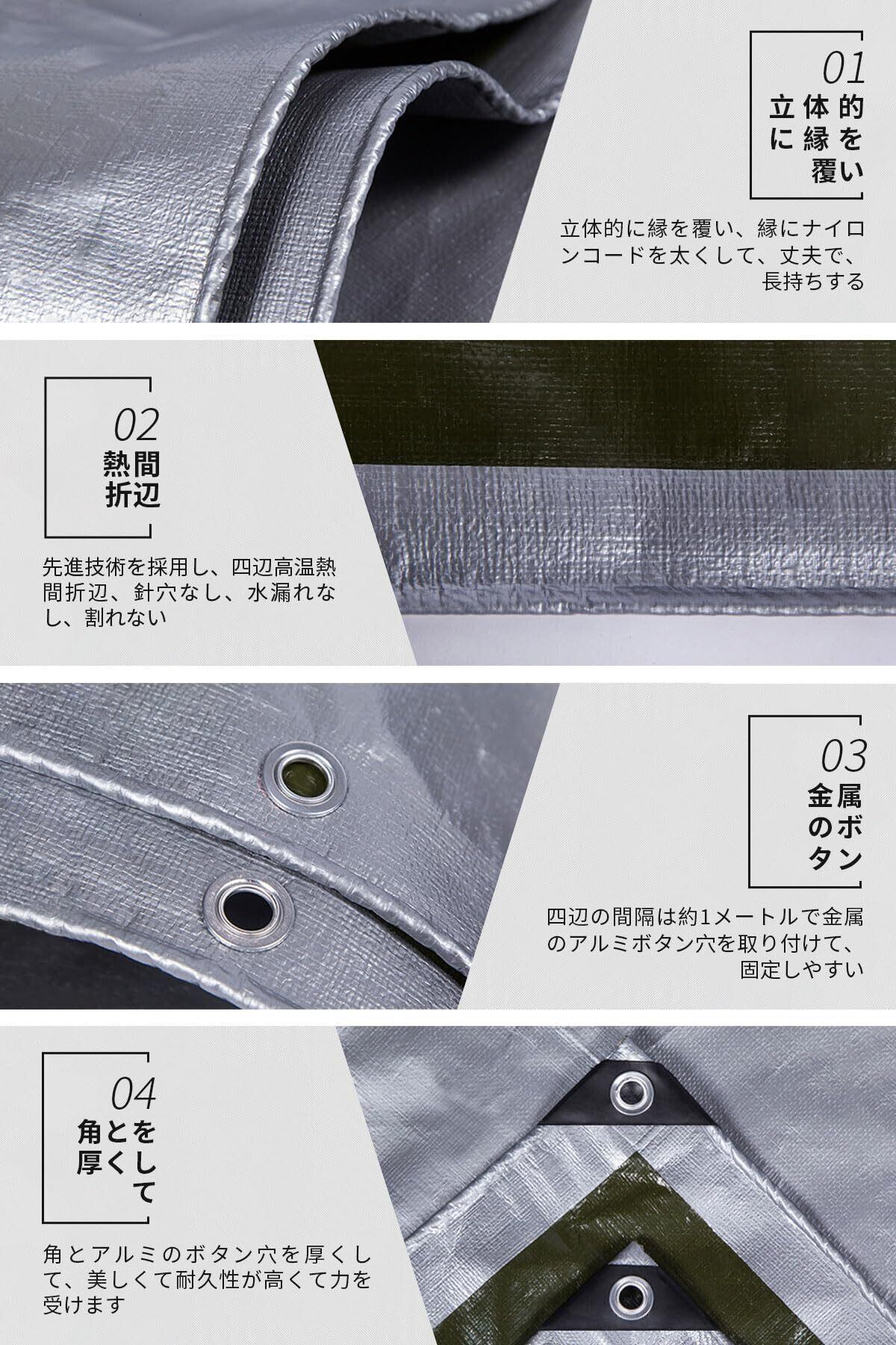 【商品仕様】シルバーシート実際のサイズ:約3.8m×4.9m、重さ:約3.6kg、両面カラー:シルバーと軍緑。厚さ:約0.4mm、防水指数:6000mm。複数の色、複数のサイズ、幅広い用途。防水シート四辺は約1メートルおきに金属の穴を設計する、周りの太いひもが二重になって立体的に縁を包む。静電気を防ぎ、寒さ熱さに耐久があり、柔らかく折りたたみやすく収納しやすい。直径5 mm、長さ約10 mの黒いひもを贈ります