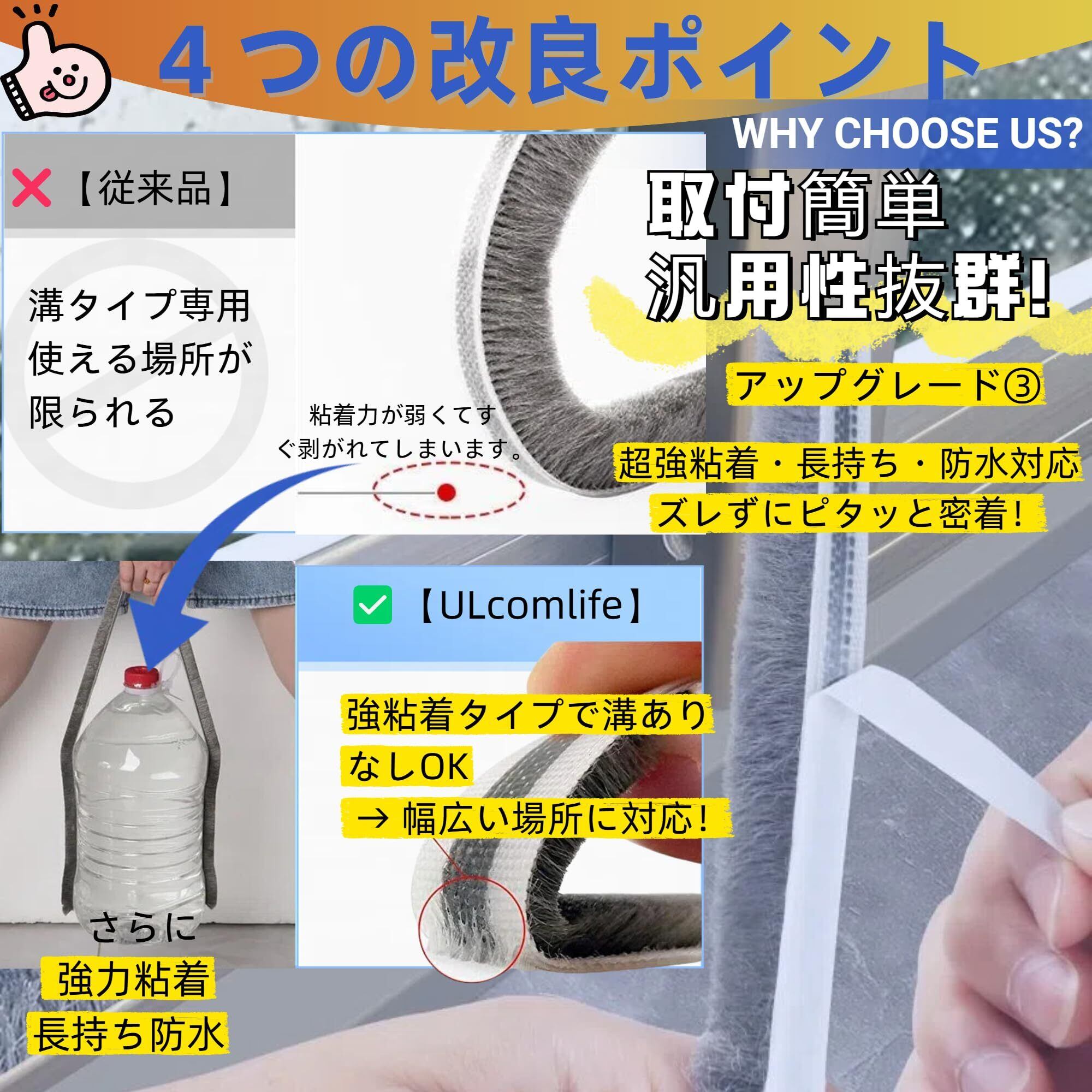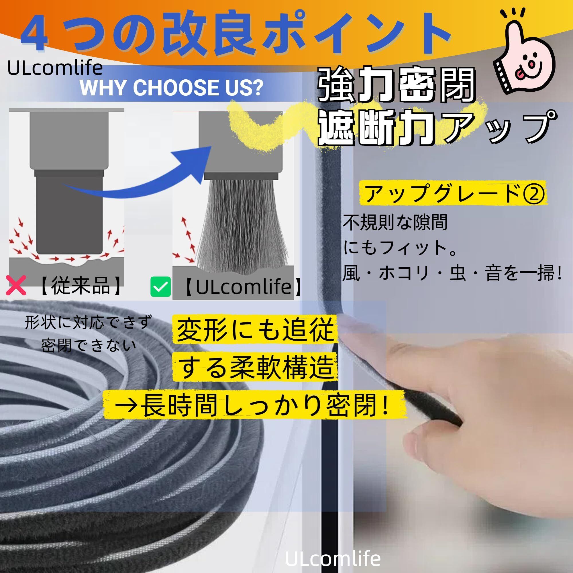 【選べる2サイズ&ULcomlifeエイエンホショウ】:5mm×10mと9mm×10mの2サイズをご用意し、さまざまなすき間や窓・ドアにぴったりフィット。モヘア隙間テープ サッシ用や虫除け隙間テープとして幅広い用途に対応します。さらにULcomlifeでは、製品に自信があるからこそエイエンホショウをお付けしています。ご購入後もずっとサポートいたしますので、アンシンしてお使いください。