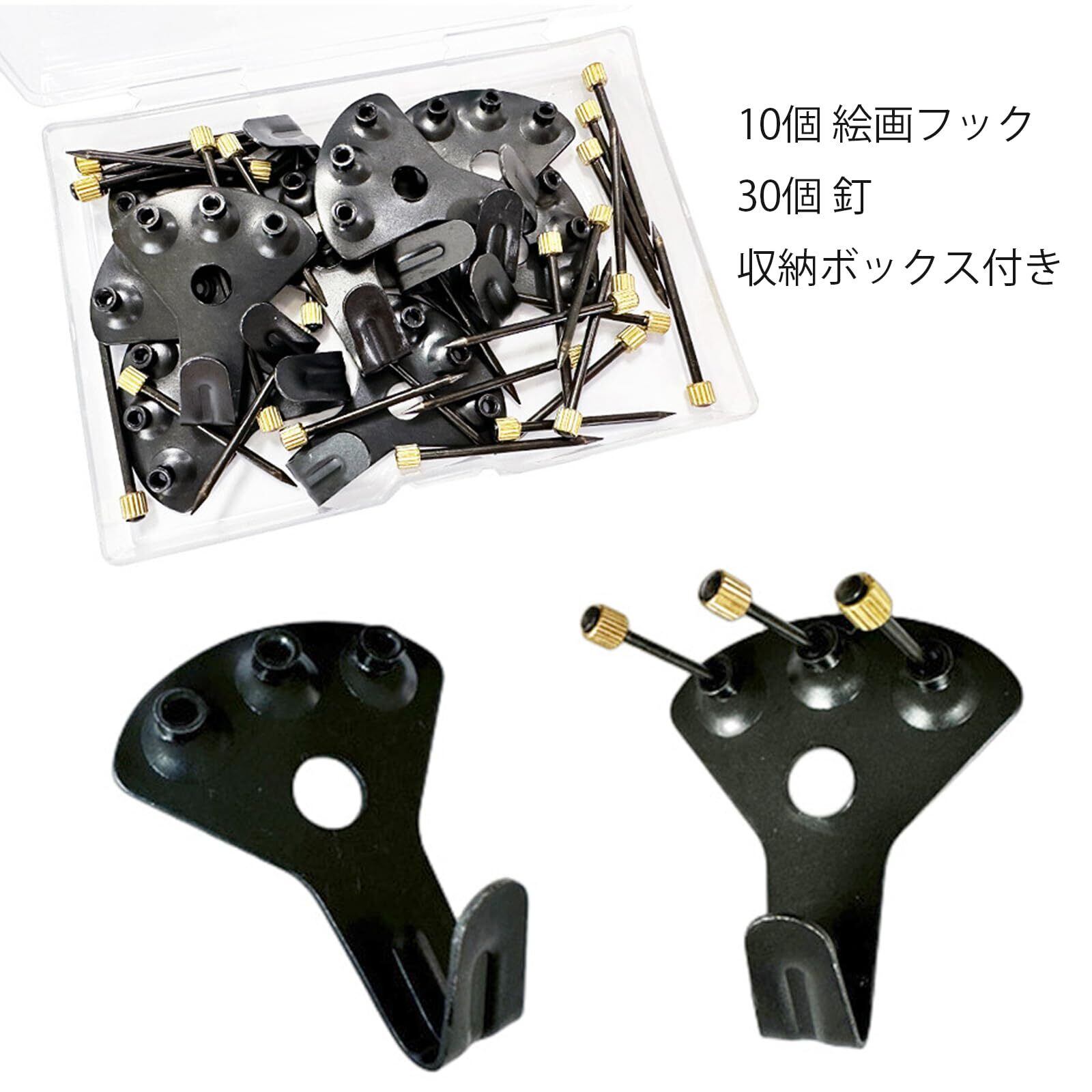 1.【セット内容】壁掛けフック*10、針*30。金属製、強固で長持ち。ブラック。便利な収納ケース付き。最大耐荷重約34kg、強力。フォトフレームの掛けたり、カレンダーの挂けたりするだけでなく、特別な日やクリスマス、ハロウィンなどの季節的な飾りを壁に手軽に飾ることが可能になります。