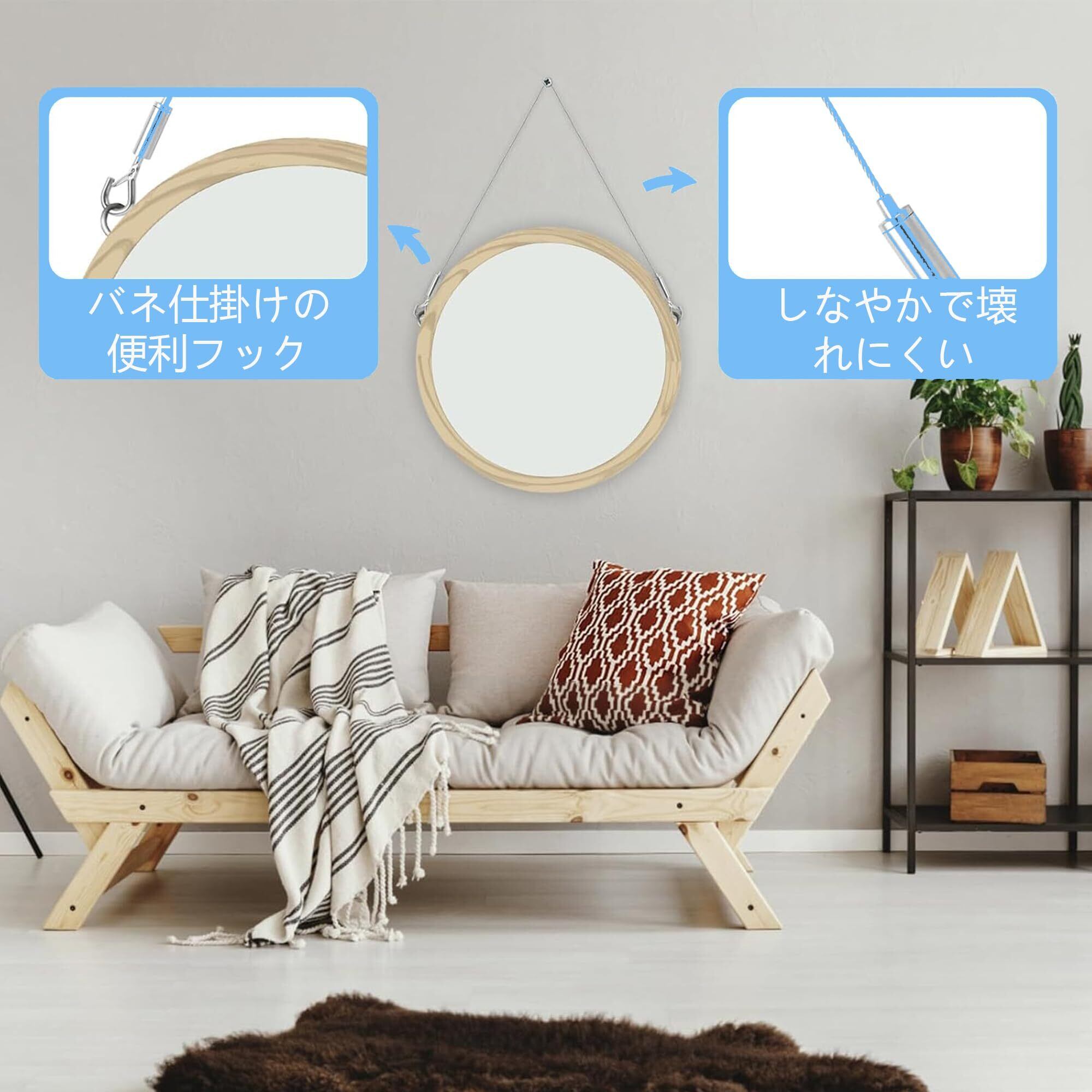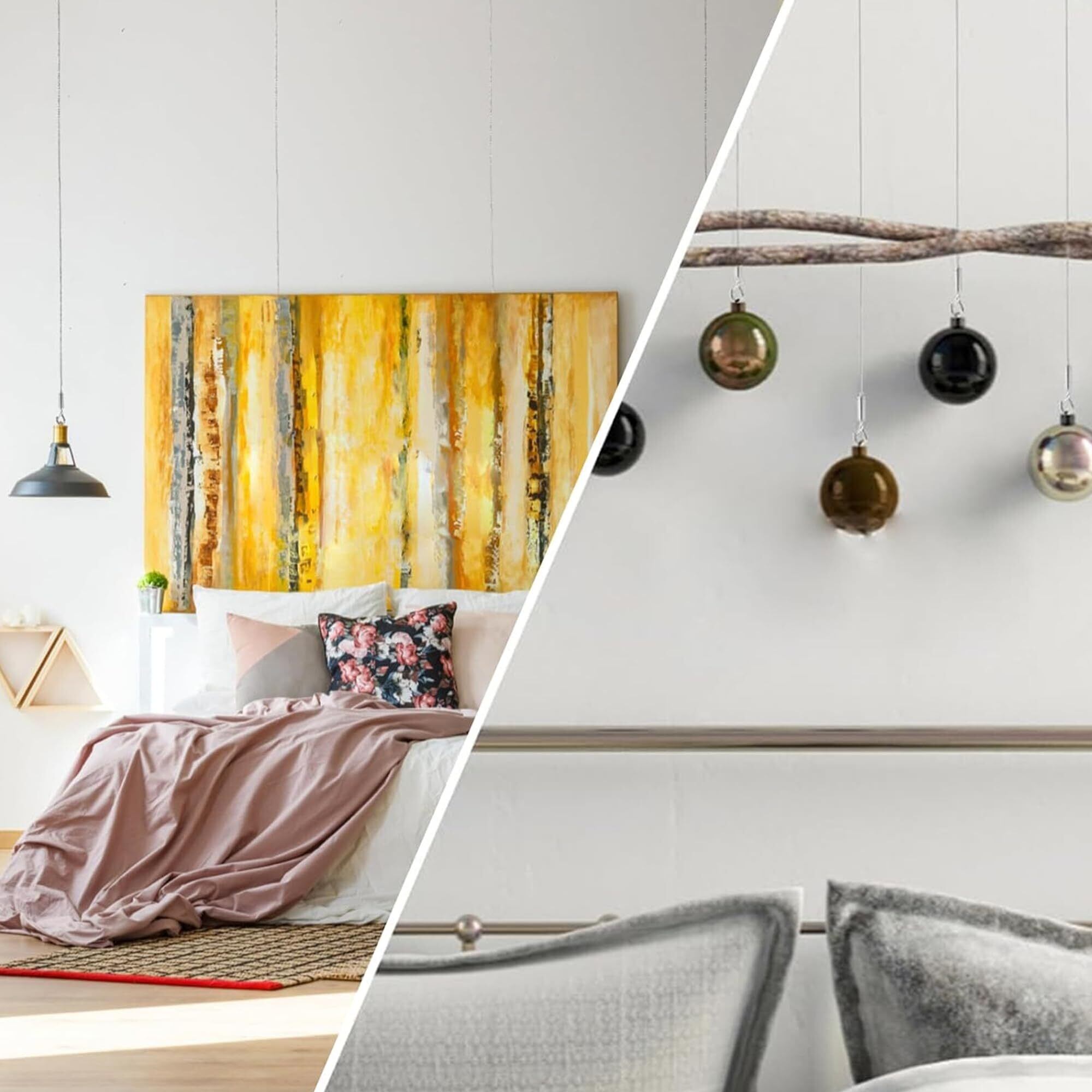 【フックの追加可能】:ワイヤーの端に付いた止め金具を取り外して(工具不要、力もいらず女性や子供でも3秒で取り出せます)、垂らしたワイヤーの下部から複数のフックを挿入するだけで、1本のワイヤーに複数のフックの追加が可能です。絵画やポスターのディスプレイはもちろん、壁面収納として活用可能で、洋服や小物の壁面収納など多様な用途に利用できます。