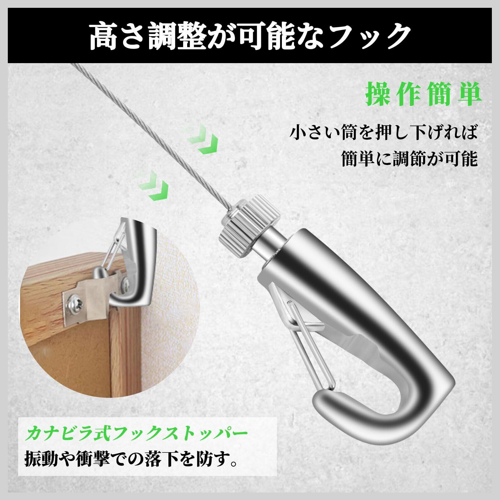 【安定した金具・高さワンタッチ調整】 ワイヤーが丈夫で金具も安定します。フックがS字フックよりも小さく、壁から浮いている部分が少なく、脱落防止のカラビナがついたフックタイプを採用します。意図せず物が落下してしまうのを防止する安全仕様。【可動式の自在フック】ワンタッチで(フック上部の筒を押し下げる)作品の吊り下げ高さを自由に調整することができ、使い勝手が良い!さらに微妙な位置調整も簡単に行えます。初心者の方でも簡単に使えます。ご注意:設置の際はフックのノブをしっかり締めてロックしてください。