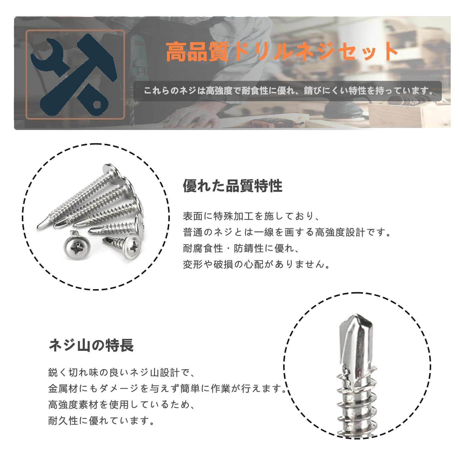 便利な収納ケース付き:専用の透明収納ケースが付属し、ネジのサイズごとに整理・保管が可能。使いたい時にすぐ取り出せて持ち運びにも便利、現場作業の効率化に役立ちます。