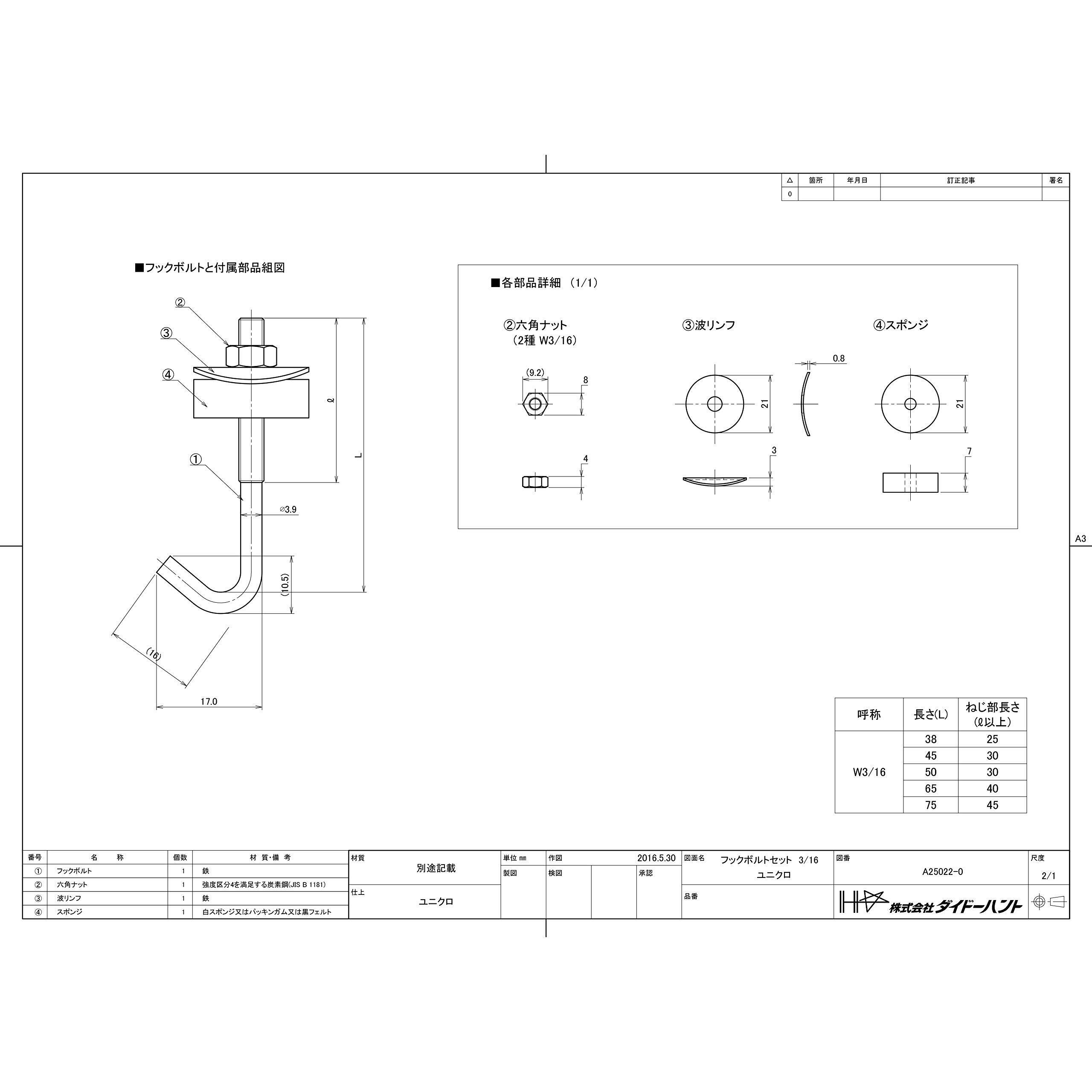 ダイドーハント フックボルトセット 3/16X50 100本入り 00032304