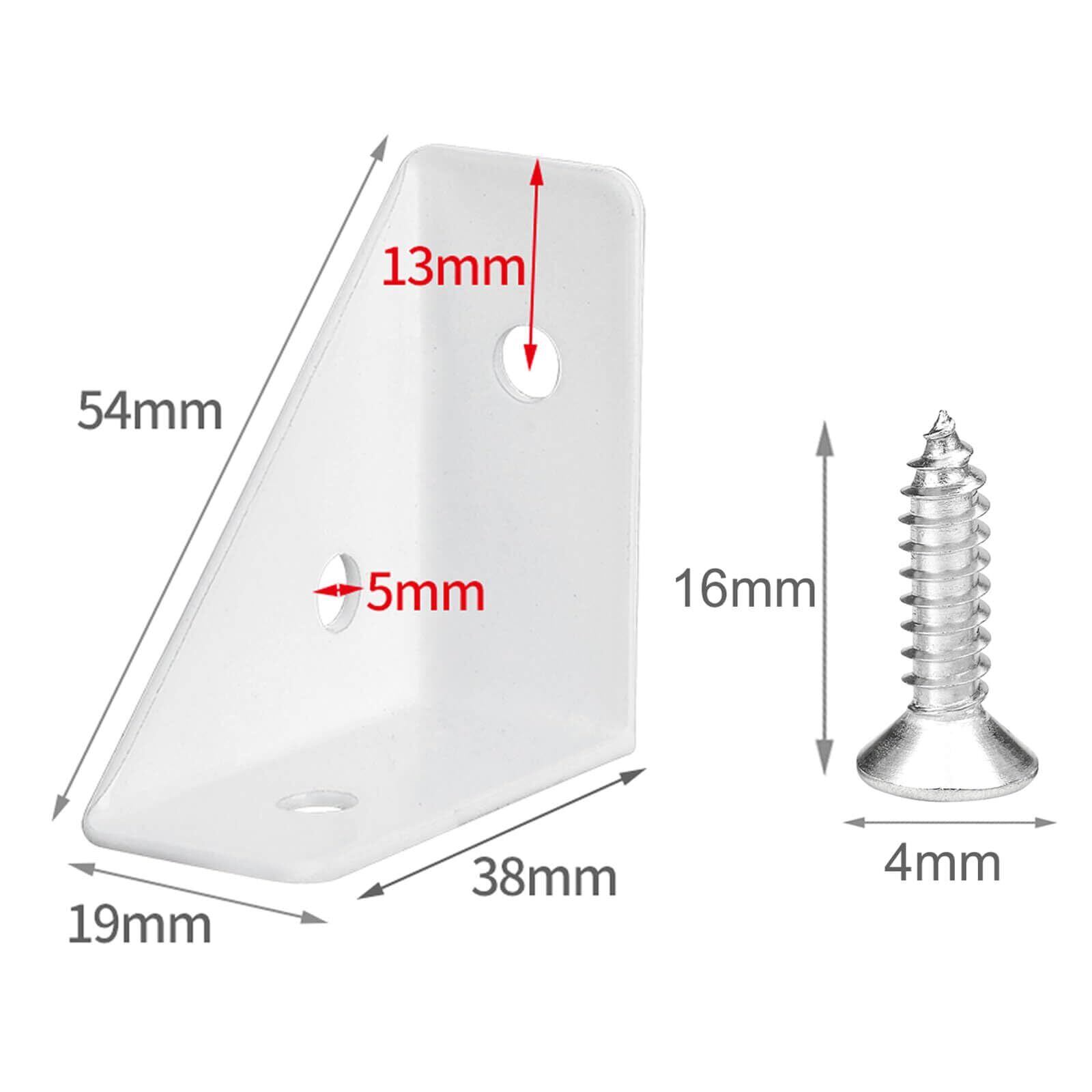 【仕様】サイズ:高さ約38mm、幅38約mm、斜辺の長さ約54mm、穴径は約5mm カラー:ホワイト 内容:8個セット、ねじ24本付き