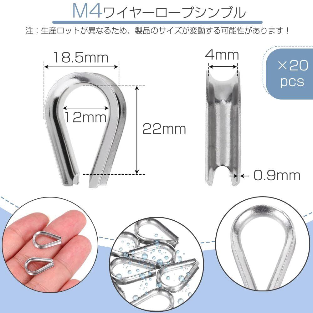 ワイヤーロープシンブル M4 ステンレス製 シンブル金具 20個セット ワイヤロープケーブル索具 耐摩耗性 耐腐食性 4mm直径のワイヤーロープ用 端末処理 接続用 船舶用 工業用 屋外用 日常生活で広く使用 ワイヤーロープ用 かしめ機固定