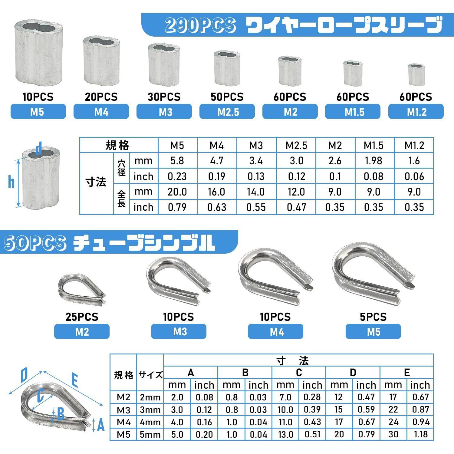【製品仕様】材質:SUS304(スリーブ);アルミ合金(チューブシンブル);セット内容:スリーブ(1.2mm*60個/1.5mm*60個/2.0mm*60個/2.5mm*50個/3.0mm*30個/4.0mm*20個/5.0mm*10個)計290点入り、チューブシンブル(2.0mm*25個/3.0mm*10個/4.0mm*10個/5.0mm*5個)計50点入り;パケージサイズ:21*11*3cm