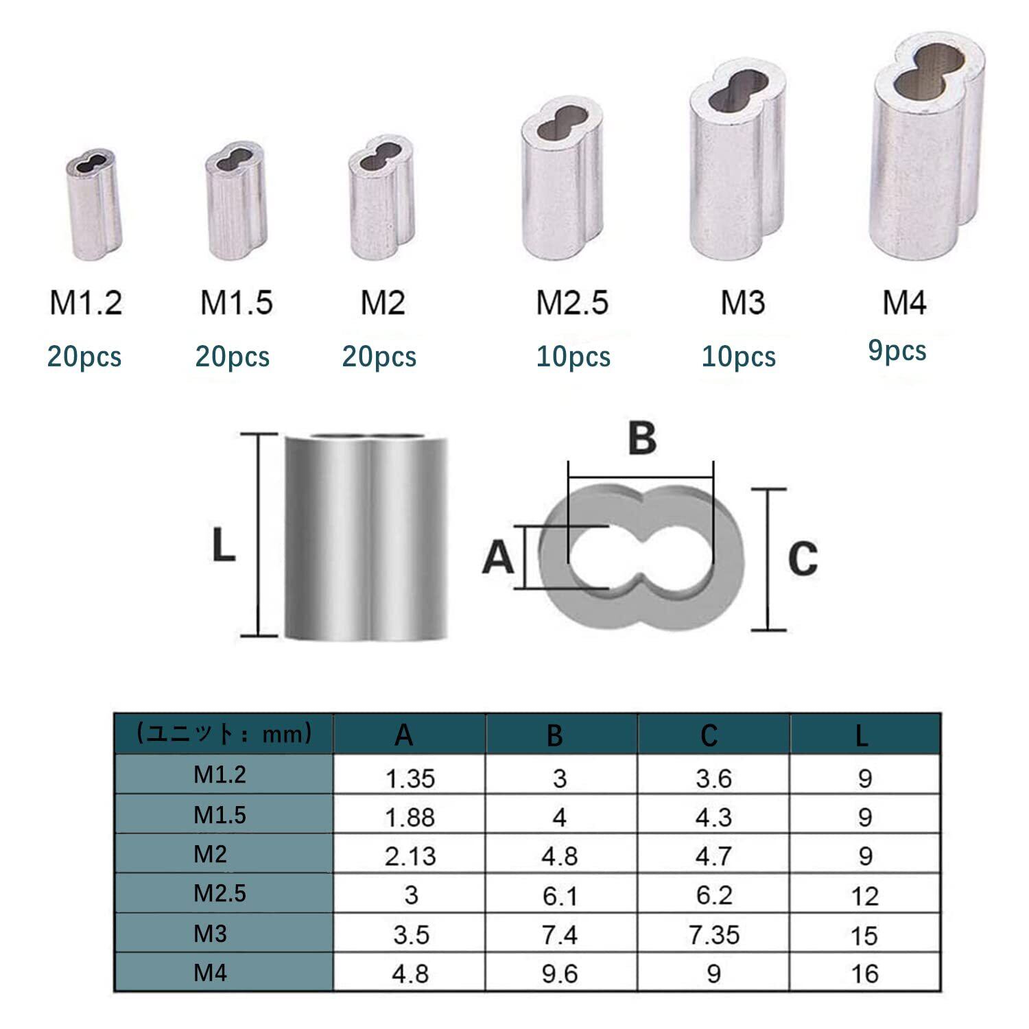 ワイヤーロープスリーブ アルミスリーブ 圧着ループスリーブ ロープチャック シルバー アルミニウム 6サイズセット(M1.2,M1.5,M2,M2.5,M3,M4) 89個入り