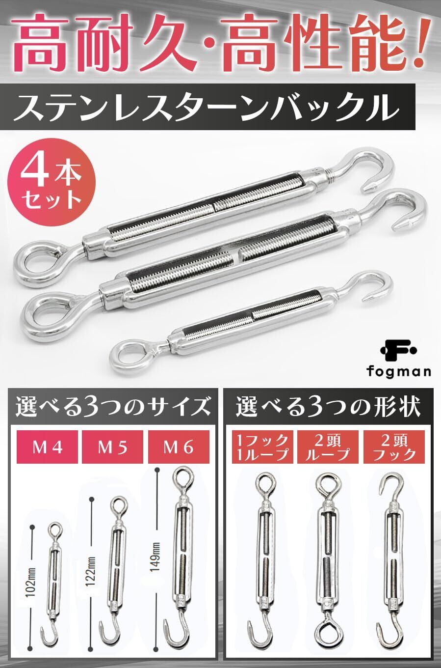 【数量限定】fogman ターンバックル ステンレス ワイヤーフック 固定金具 ワイヤーロープ 4本セット (M5 2頭フック)