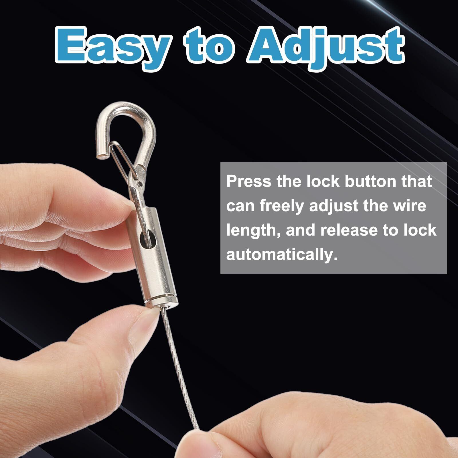 利点:銅と鉄製のニッケルメッキ仕上げの鋼ワイヤーロープハンガーは、退色に強い滑らかな表面を誇ります。腐食や錆びに強く、高い硬度、耐摩耗性、長寿命を備えた安定した構造を特長としています。内部ボールロックデザインは、一定のテンションを受け入れてロック状態にするために固定するためのものです。