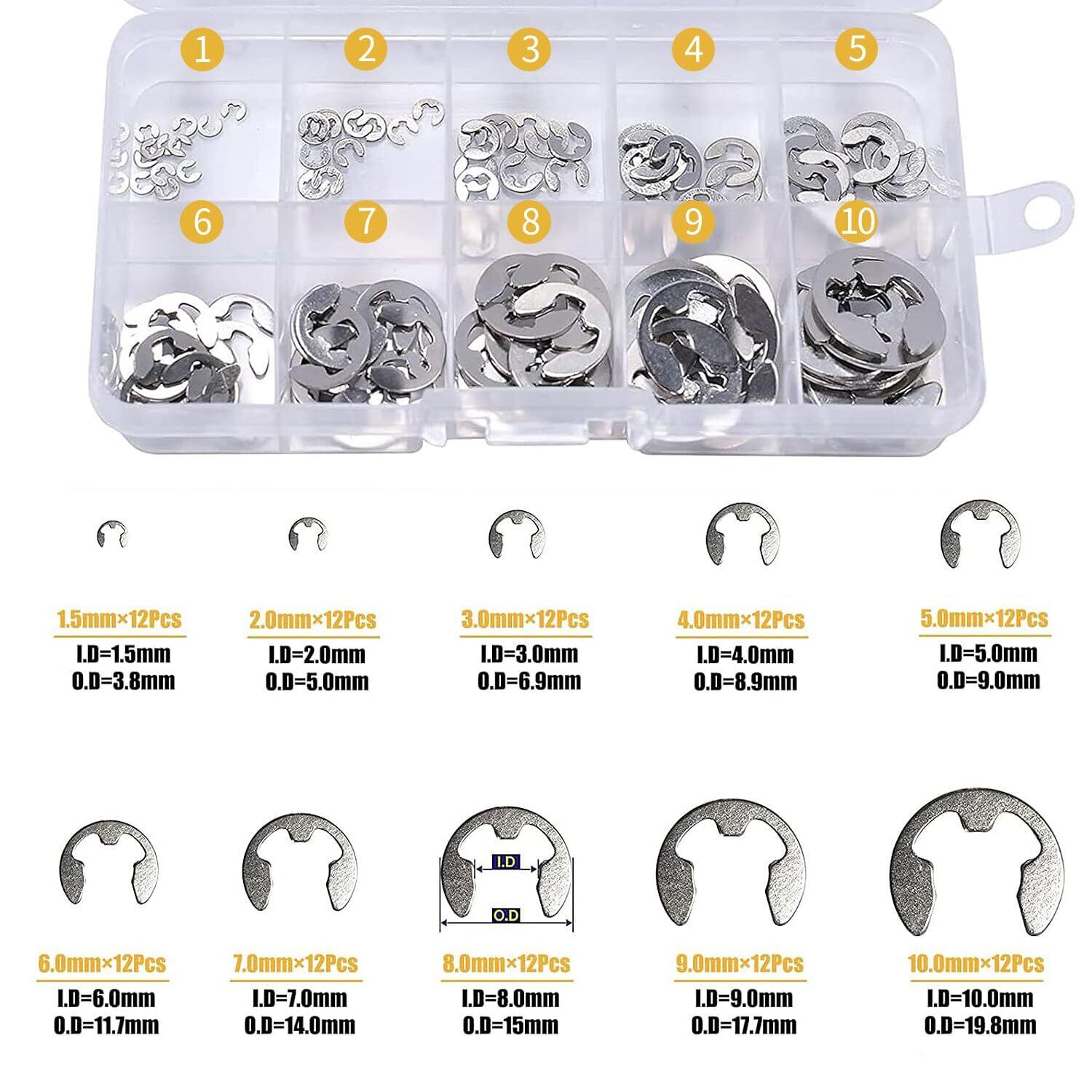 スナップリング eリング 120個セット M1.5-M10 304ステンレス鋼 耐油性 収納ケース付き E型止め輪 機械部品固定用 工具セット 収納ボックス付き