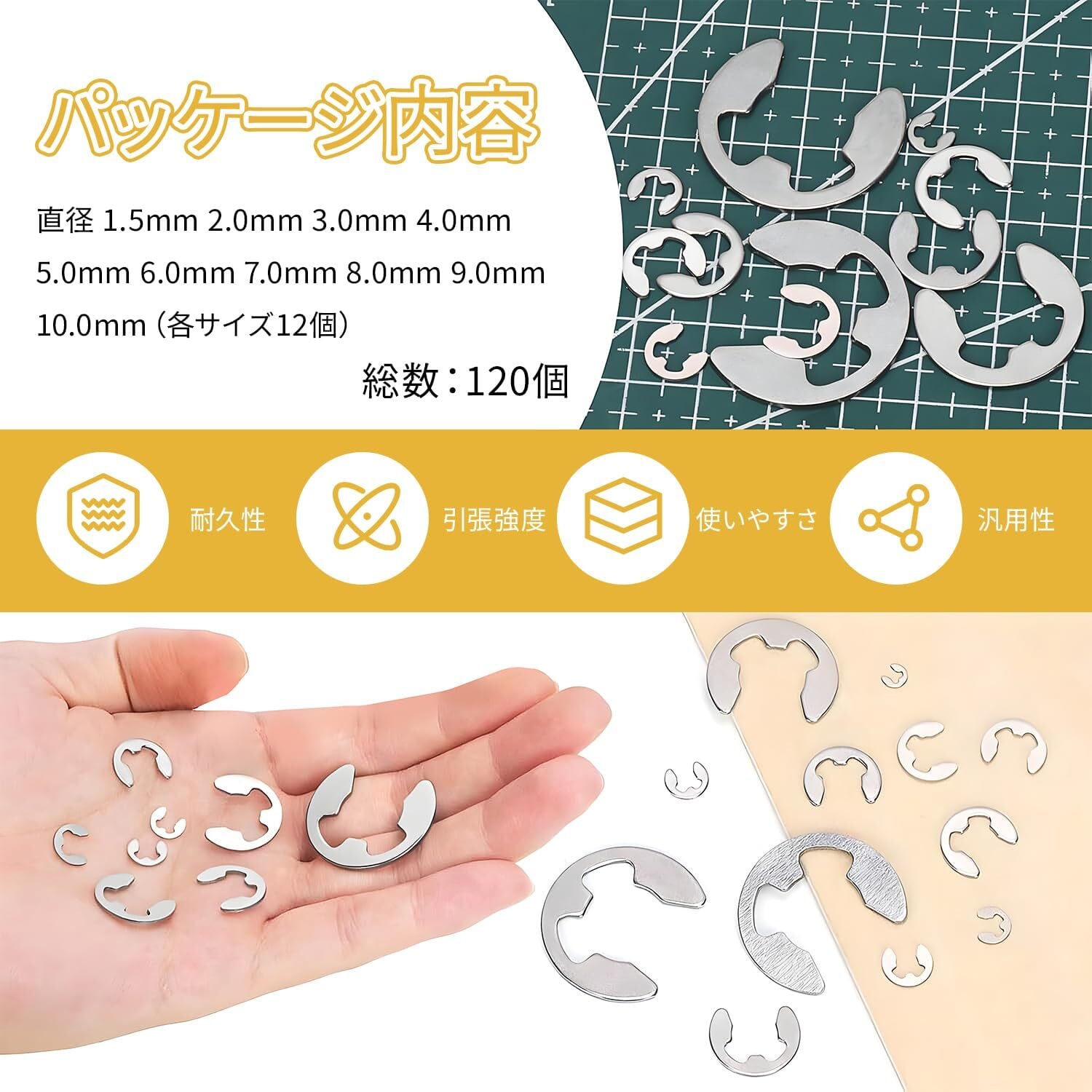 【 セット内容】全120個セット(各サイズ12個入り)。高品質304ステンレス鋼製、シルバーカラーのE型スナップリングです。
