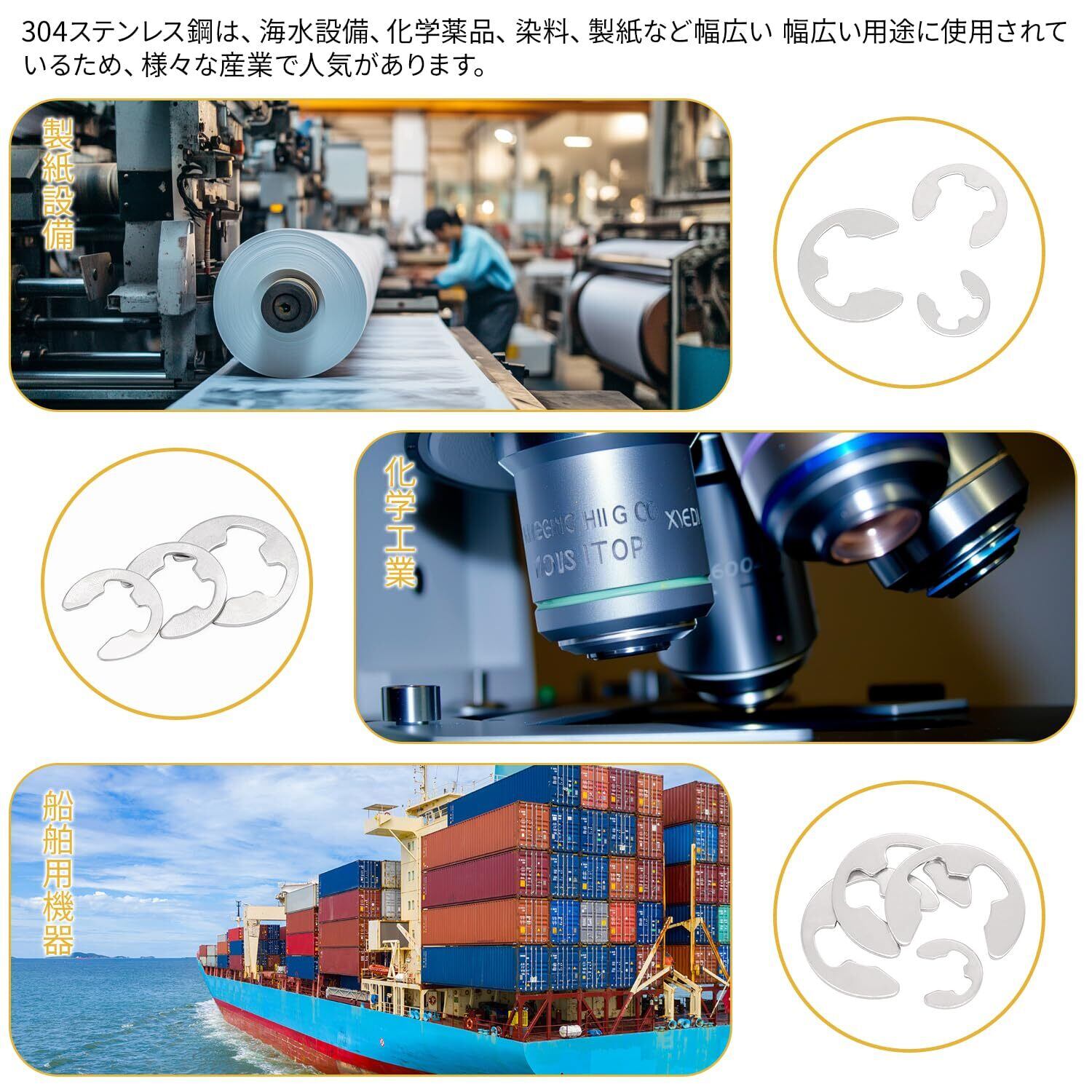 【 簡単取り付け設計】E型スナップリングの特殊形状により、工具を使わずに手早く装着可能。機械のメンテナンス時間を短縮します。
