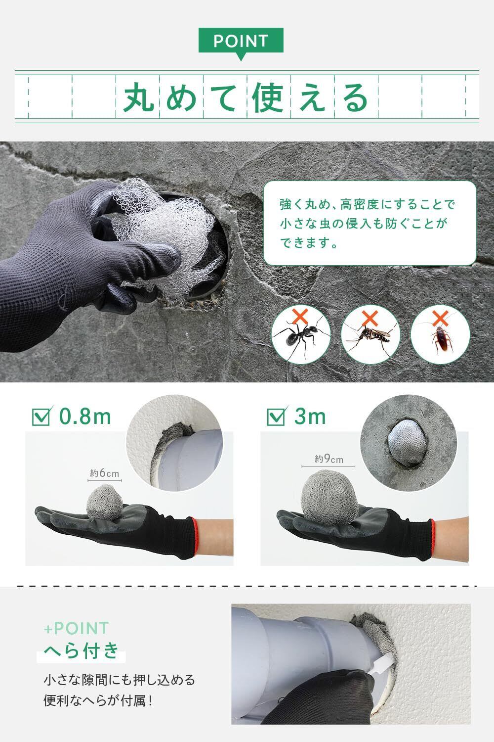 【小さな害虫から比較的大きな害獣までこれ一個で対策いただけます】穴に詰めて使用する場合は、ぎゅうぎゅうに詰めていただくと高密度になりますので、アリやダンゴムシ、蚊など小さな虫の侵入をふさぎたい場合は、強く丸めてご使用ください。通気口や排水口など、完全には塞がずに害虫・害獣の侵入を防ぎたい場合は、二重三重と重ねていくことにより、メッシュの網目の細かさを調整できます。アリ・蚊・ゴキブリ・カタツムリ・ダンゴムシのような小さな害虫から、ゴキブリ・ネズミ・こうもり・ヘビなどの害獣までこれ一つで対策もばっちりです。