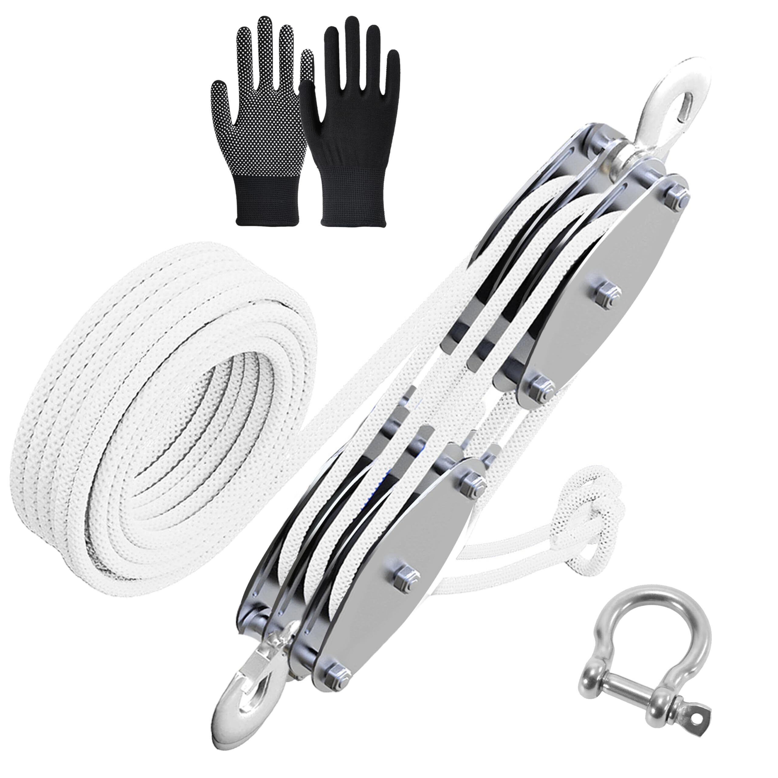 ホイストロープ ホイスト 滑車 吊り上げ 500kg ロープ 6MM×15M 3輪滑車ホイスト 滑車 荷揚げ M10 D型シャックル付き 手袋付き 吊り上げ比5:1 クレーン用 (3輪)