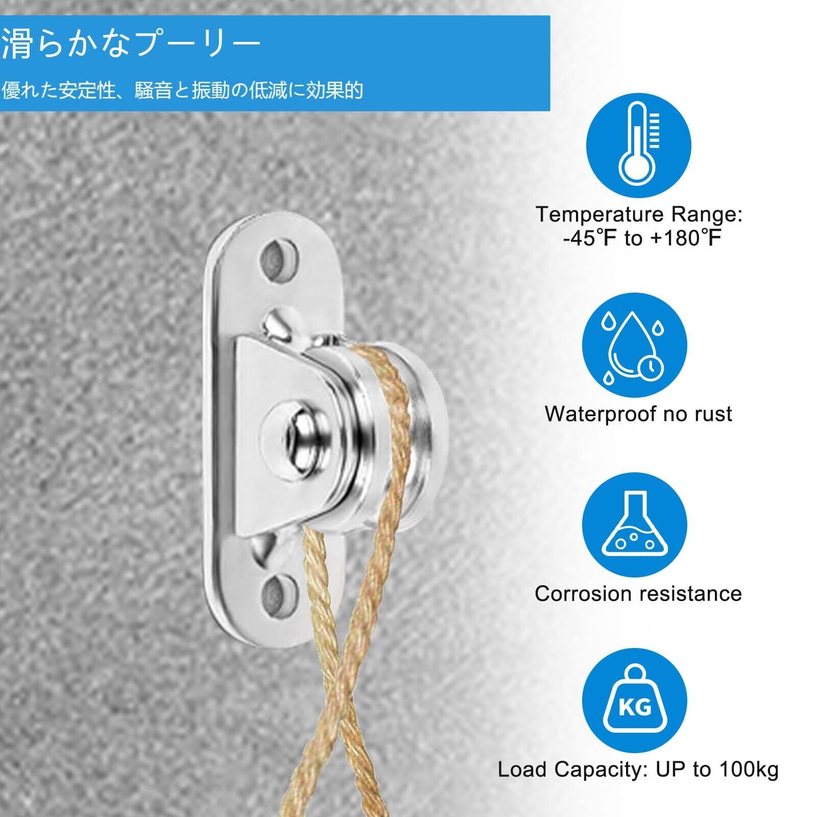️取り付け簡単:2つのベース穴にネジを通し、プーリーをコンクリート天井や木の梁に取り付け、ワイヤーやロープをホイールに通すとスムーズに作動します。