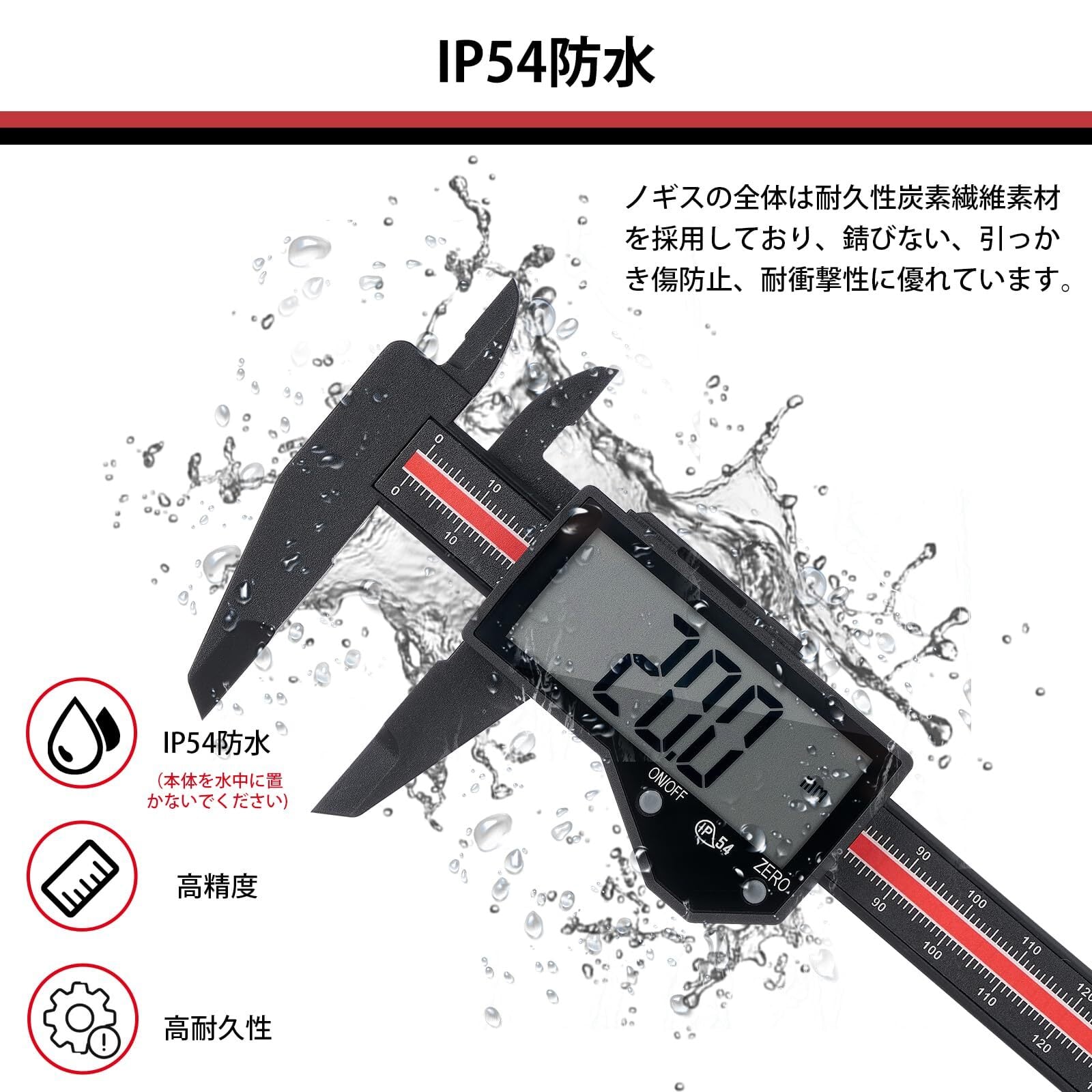 耐磨耗性办拔群:ノギスの全体は耐久性炭素繊維素材を採用しており、錆びない、引っかき傷防止、耐衝撃性に優れています。柔らかなカ一ボンフアイバ一を採用することで、测定対象品に傷を付けません。