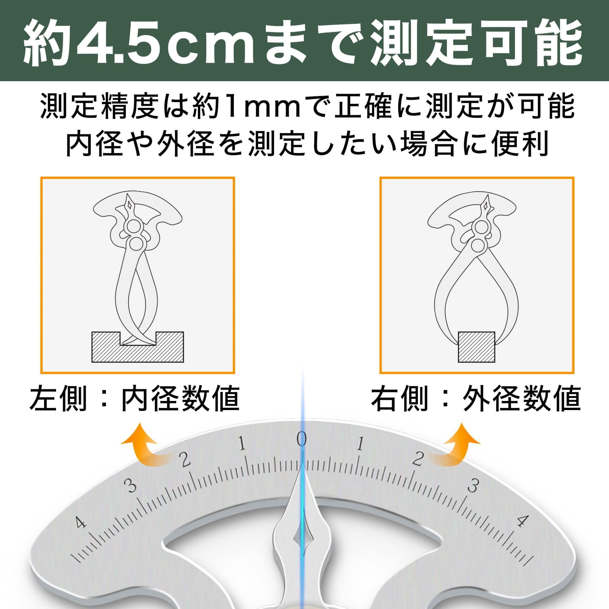 約4.5cmまで測定:こちらのキャリパーゲージの内径と外径の測定範囲は、どちらも約4.5cmまでとなっています。測定精度は約1mmとなっており、正確に測定できます。内径や外径を素早く測定したい場合にぜひご活用ください。