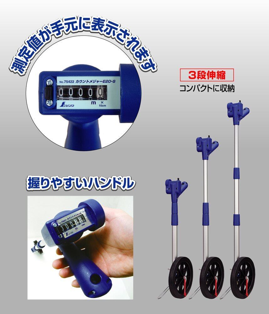 特長 読み取りやすい手元カウンターです。 握りやすいハンドル形状です。 3段伸縮でコンパクトに収納可能です。 歩きながら簡単に安全に距離測定ができます。 用途 工事現場・不動産関係・ゴルフ場等の距離測定