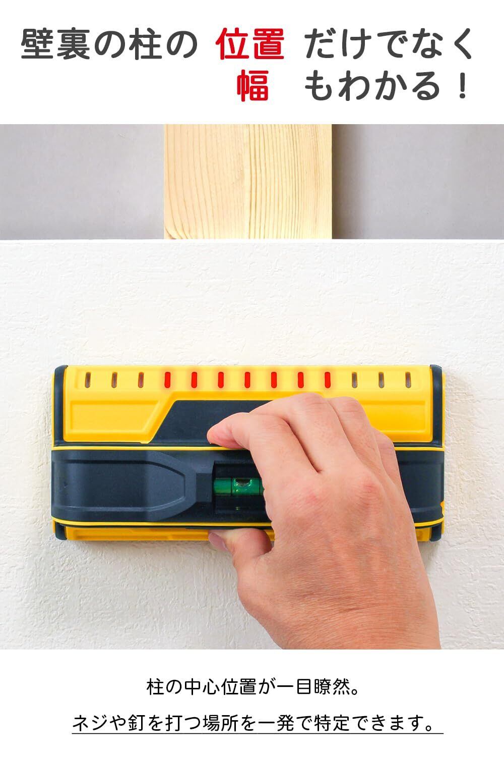 米国取得(US8476912, US8791708, US8836347, US8884633)。壁裏の見えない間柱の「位置」および「幅」を 素早く・簡単・正確に 見つける下地センサーです。壁裏の柱の「中心位置」が一発で見つけられます。 下地チェッカーとして釘打ちの下調べなどに便利です。下地探しの際に壁を傷つけることはありません。