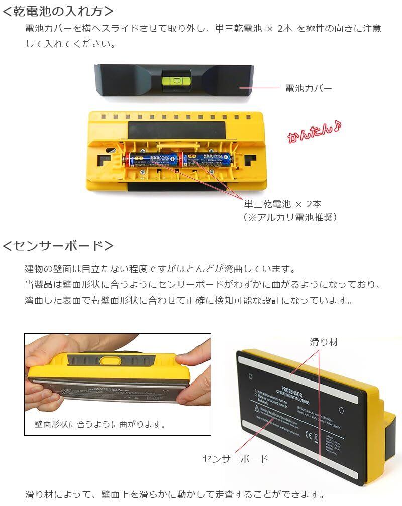 サイズ:横18.9×縦8.2×奥6.1cm、重さ:267g、電源:単3電池(アルカリ電池推奨)×2個、探知検出深度:約43mm、バブル水準器装備、日本語説明書、メーカー1年付き。※ 本センサーは静電容量の変化を検知して壁裏の物体を検出する仕組みですので、密度が一定でない壁面(漆喰など)では安定した検出ができない場合があります。ダンボールは空気の層と紙の部分が交互に組み合わさる構造なのでセンサーを動かしたときに静電容量が局所的に変化するためノイズ的な誤検出をする場合があります。石膏ボードや木の板など、一般的によく使われている壁材は密度が一定なので安定して検出できます。