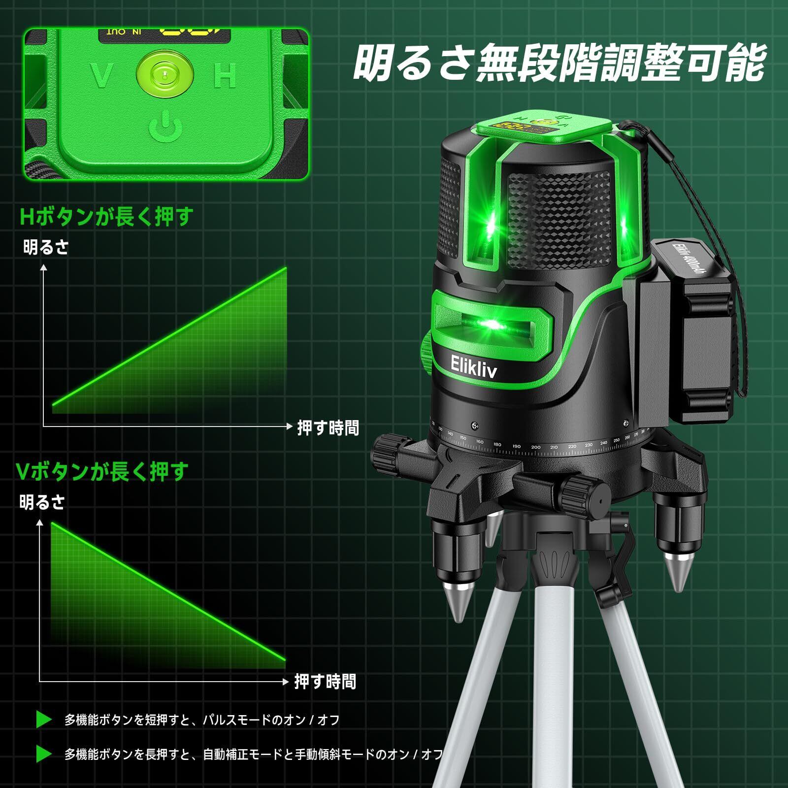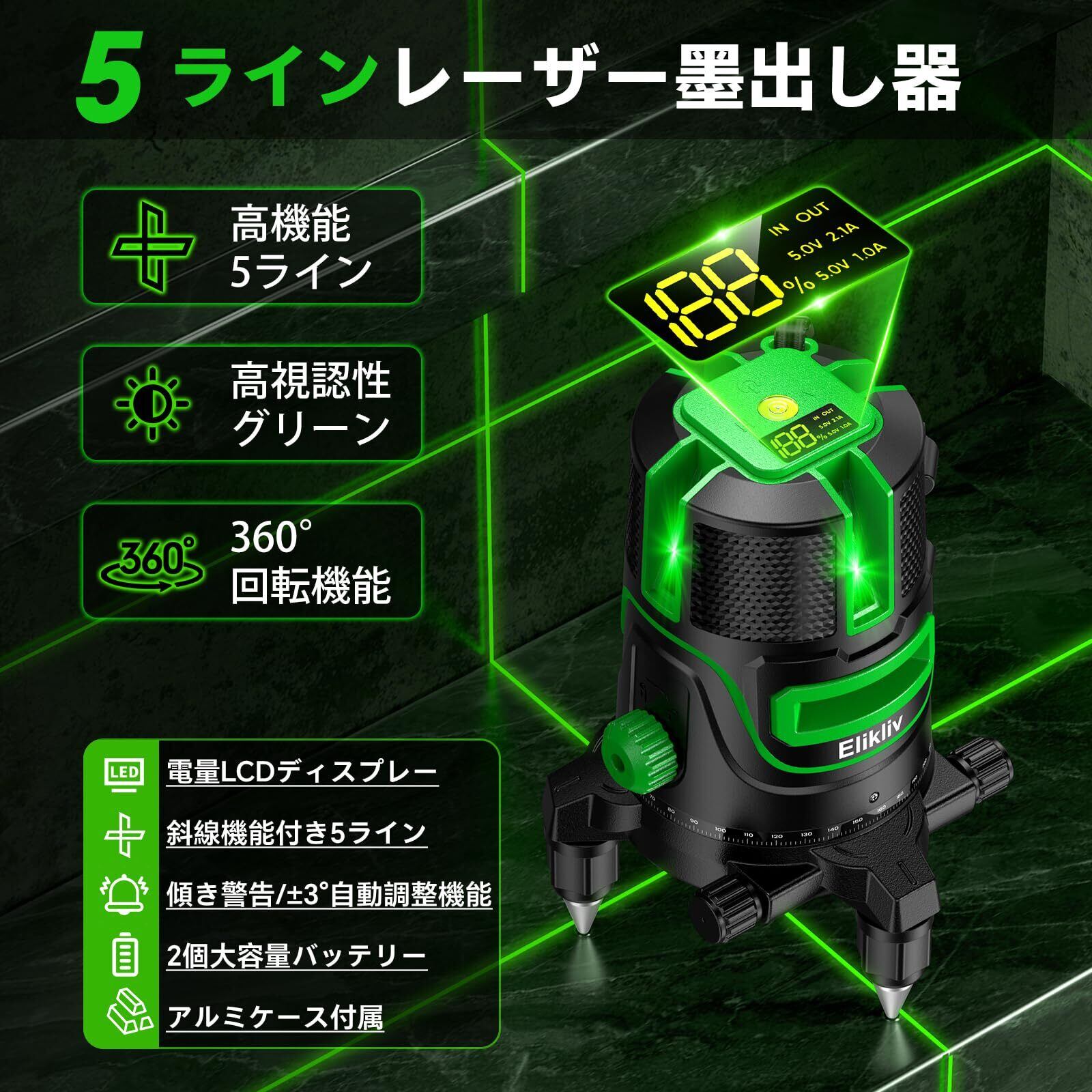 【2025年最新】Elikliv レーザー墨出し器 グリーンレーザー 5ライン LCD電量ディスプレイ搭載 三脚付き 高輝度・高出力 レーザー水平器 5ライン6点 レベル測定器 大型アルミ三脚付 軽天作業・タイル張替え・建設・建築・DIY対応 予備バッテリー2個・昇降式三脚・収納ケース付 型番:R5 Pro