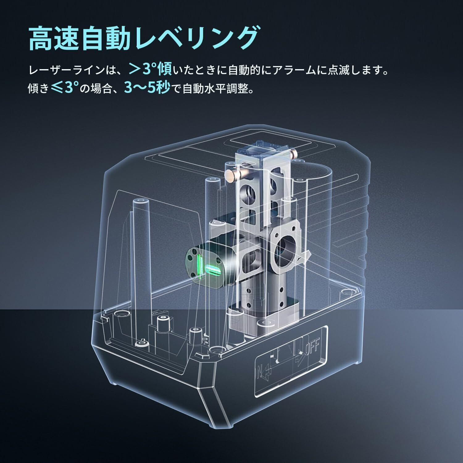 3. 3 段階の明るさ調節:レーザー墨出し器 Janmifly LL2G は 3 段階の明るさ調節機能を備えており、使用シーンに合わせて明るさを選ぶことができます。