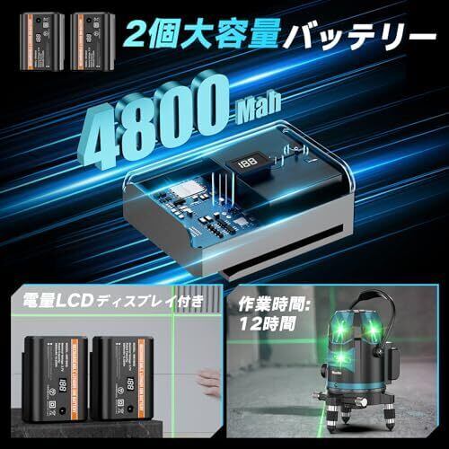 【2個大容量バッテリー・電量LCDディスプレー】2個の大容量充電式のバッテリーが付属しており、そのため、充電を忘れても使えなくなるような心配はありません。長時間の作業にも対応でき、1日の仕事量を満たすのに十分です。これにより、作業に集中でき、シンプルで効率的な作業を行うことができます。また、墨出し器本体にはLCDディスプレーが搭載されており、電池残量を簡単に確認できます。