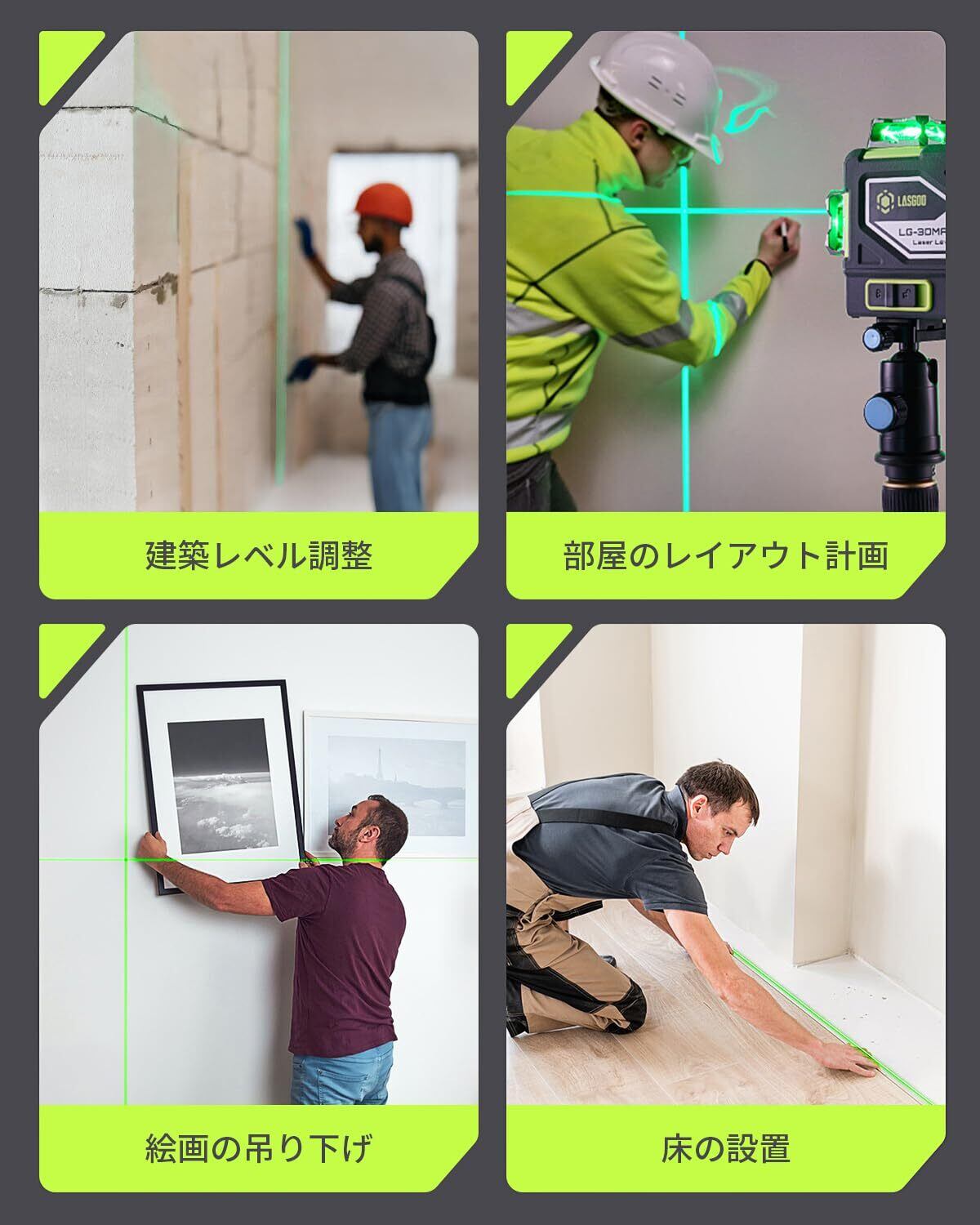 3x360 度全方位カバー:LasGoo LG-3DMAXは、1本の水平ラインと2本の垂直ラインを備え、水平方向と垂直方向の両方で包括的なカバーを提供します。これにより、あらゆる方向からの測定とマーキングが可能になり、迅速な視覚化とレイアウトの完了ができるため、作業効率が向上します