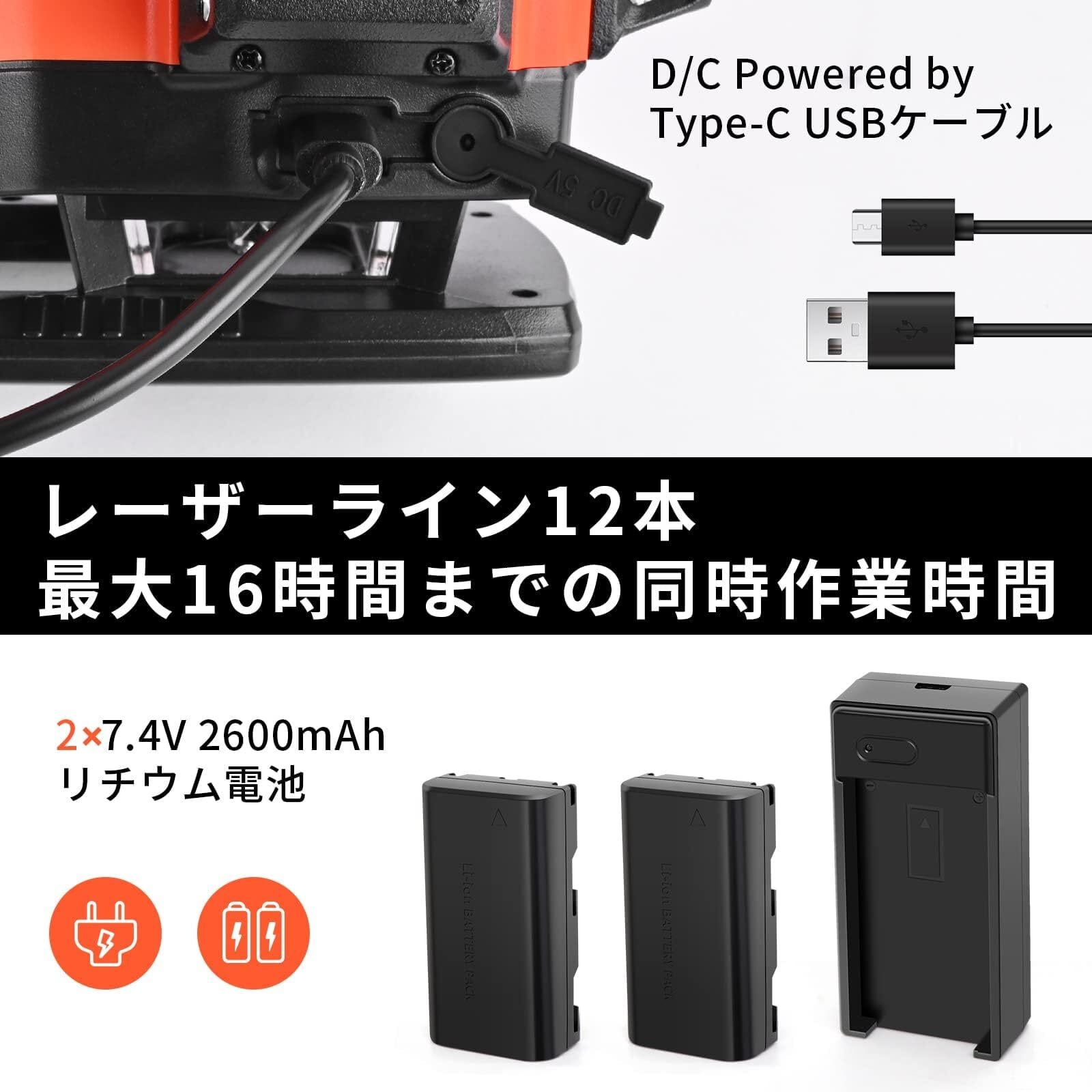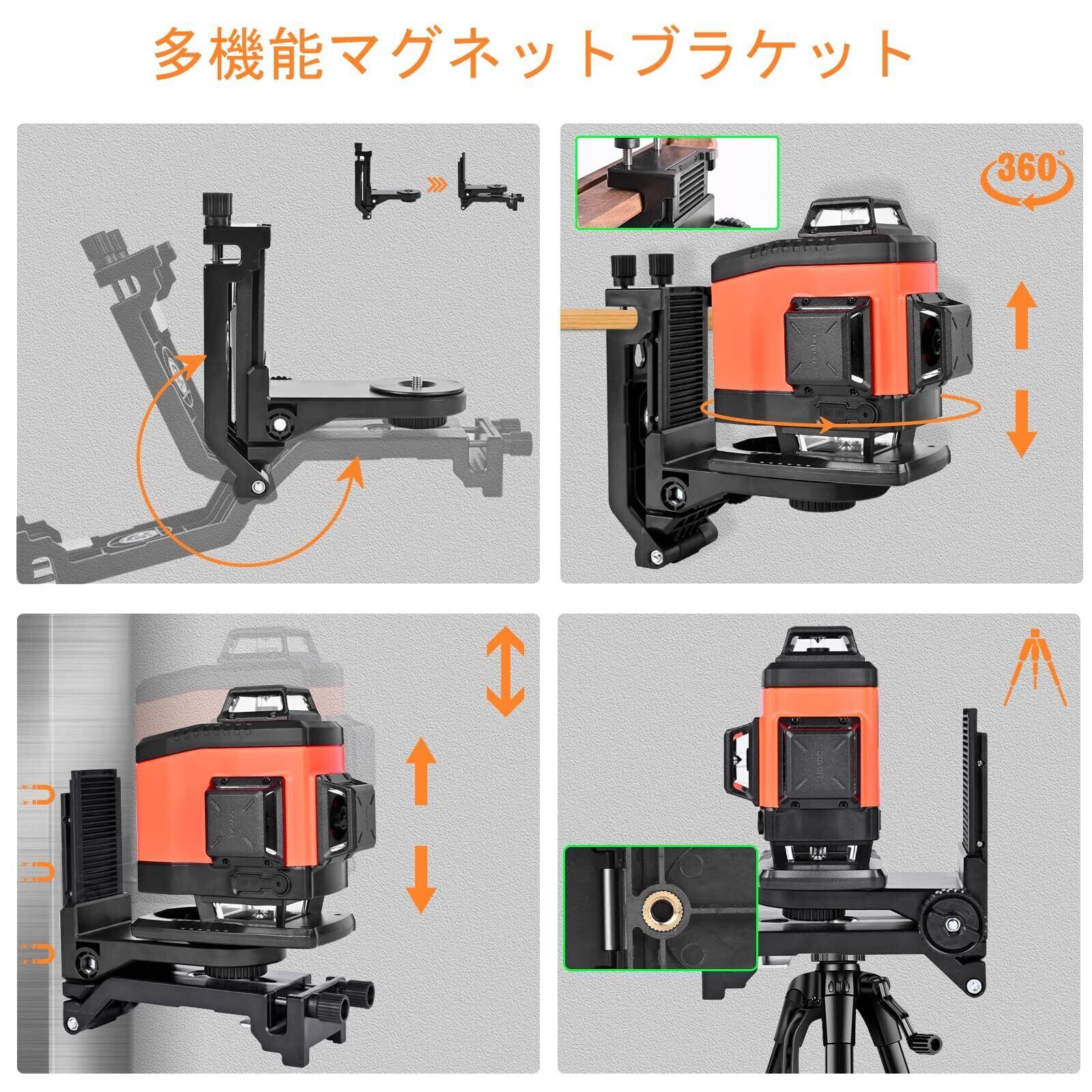 【マグネットブラケットとデュアルバッテリー】DOVOHレーザー墨出し器には多機能マグネットブラケットが含まれており、金属面に取り付けたり、ボードにクリップしたり、釘にぶら下げたりすることができます。K4-360Gレーザー墨出し器はデュアル7.4V 2600mAhリチウム充電式電池が含まれており、より長い作業時間を提供します。