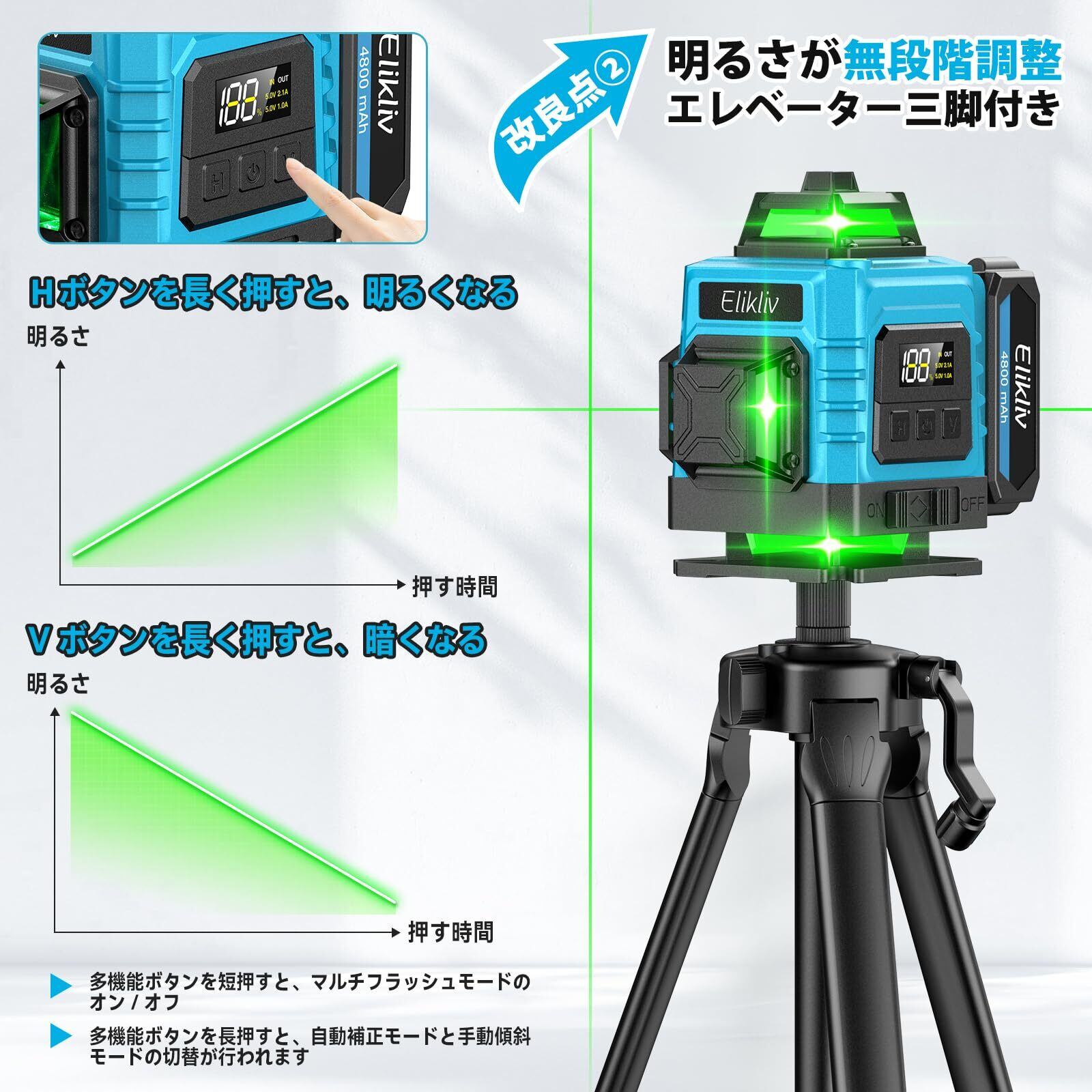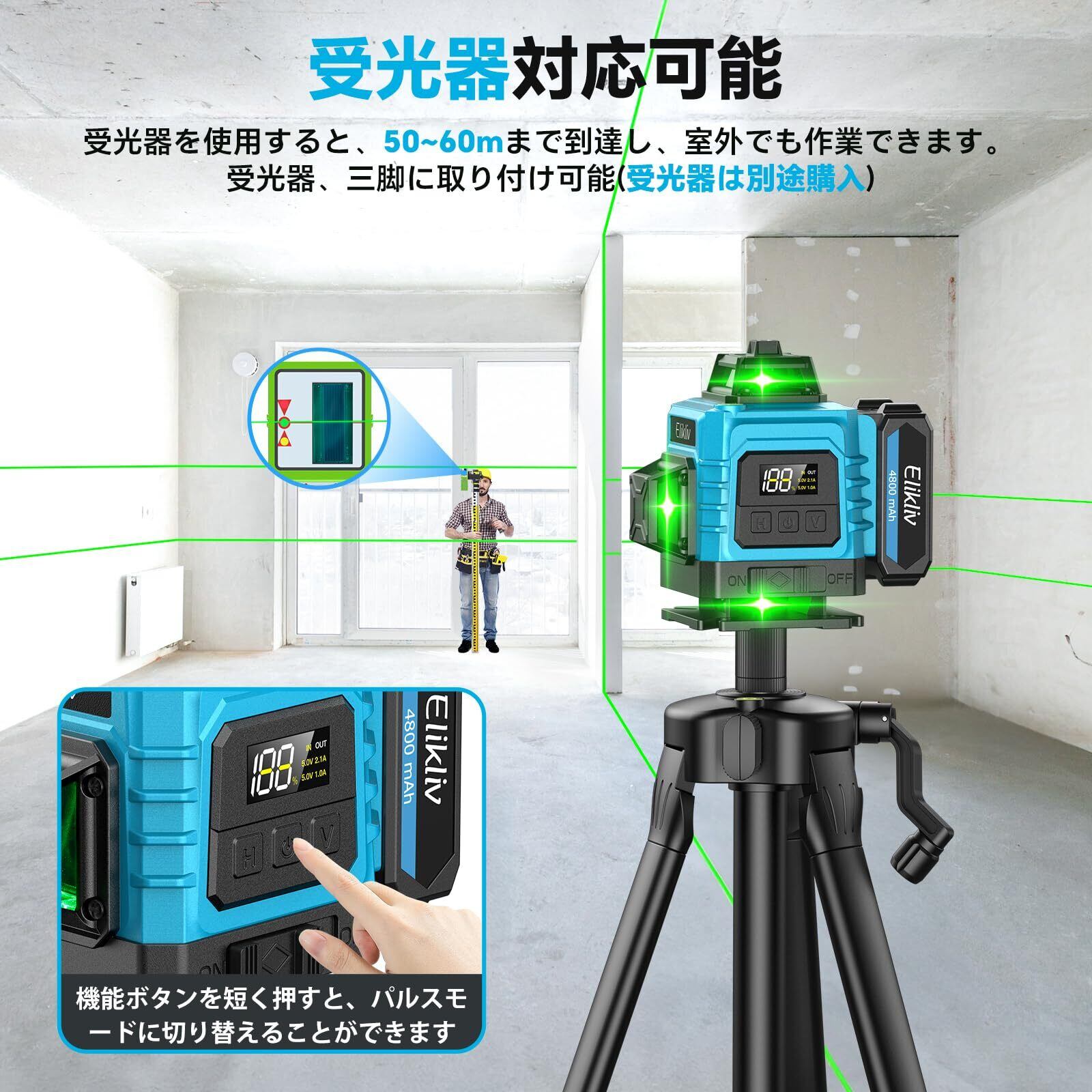 【2025年新登場】 Elikliv レーザー墨出し器 グリーンレーザー 16ライン 4x360°フルライン 水平器 レーザーレベル 水準器 メタル360°回転ベース LCDバッテリー残量表示機能 自動補正 高輝度・高精度 受光器対応 軽天・内装作業 DIY 測量・建築用 リモコン付き 大容量バッテリー2個&三脚セット