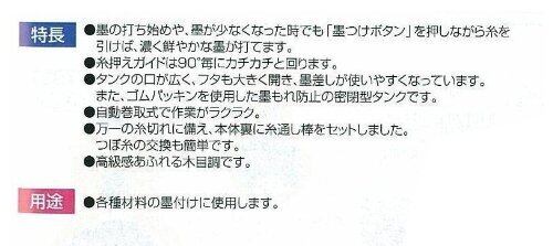 ●各種材料の墨つけに使用する墨つぼ。 ●墨の打ち始めや墨が少なくなった時でも「墨付けボタン」を押しながら糸を引けば、濃く鮮やかな墨が打てます。 ●糸押さえガイドは90°毎にカチカチと回ります。 ●ゴムパッキン使用の密閉タンクで墨漏れを防ぎます。 ●本体裏に糸通し棒がセットしてあります。 ●自動巻取式なので作業が楽になります。