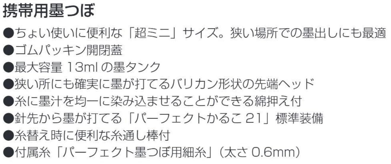 交換部品:パーフェクト墨つぼ用太糸(PS-ITOL)、細糸(PS-ITOS)、極細糸(PS-ITOSS)、剛糸(PS-TITO)、パーフェクトポイントカルコ尖針(PS-PKALTH)、パーフェクトポイントカルコ(PS-PKAL)、パーフェクトかるこ21(SUM21-KAL)、ピーラインセフカル(PS-SKAL)、パーフェクト楽カル(PR-KAL)。