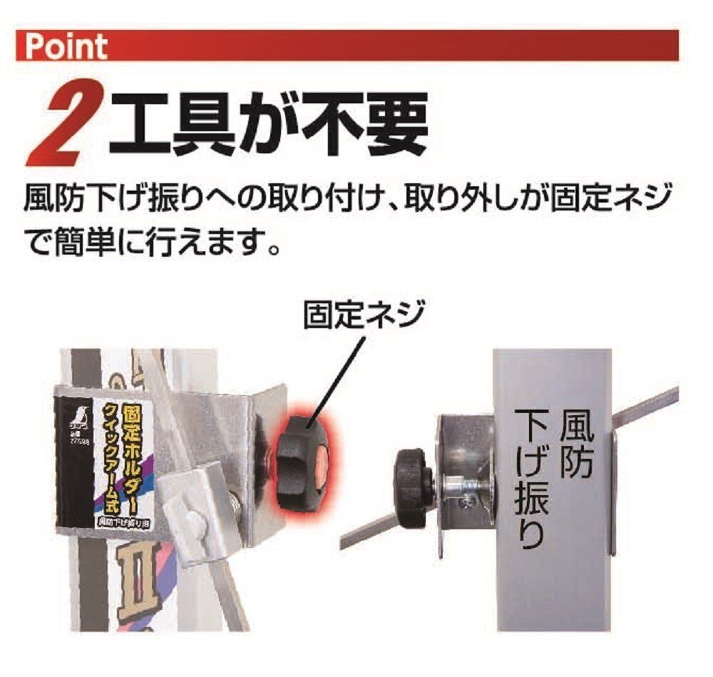 風防下げ振りへの取り付け、取り外しが固定ネジで簡単に行える。