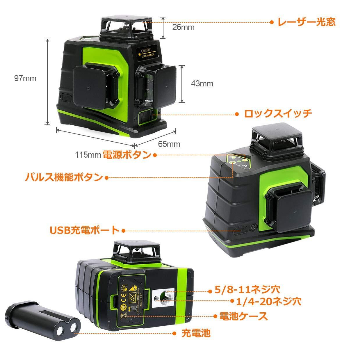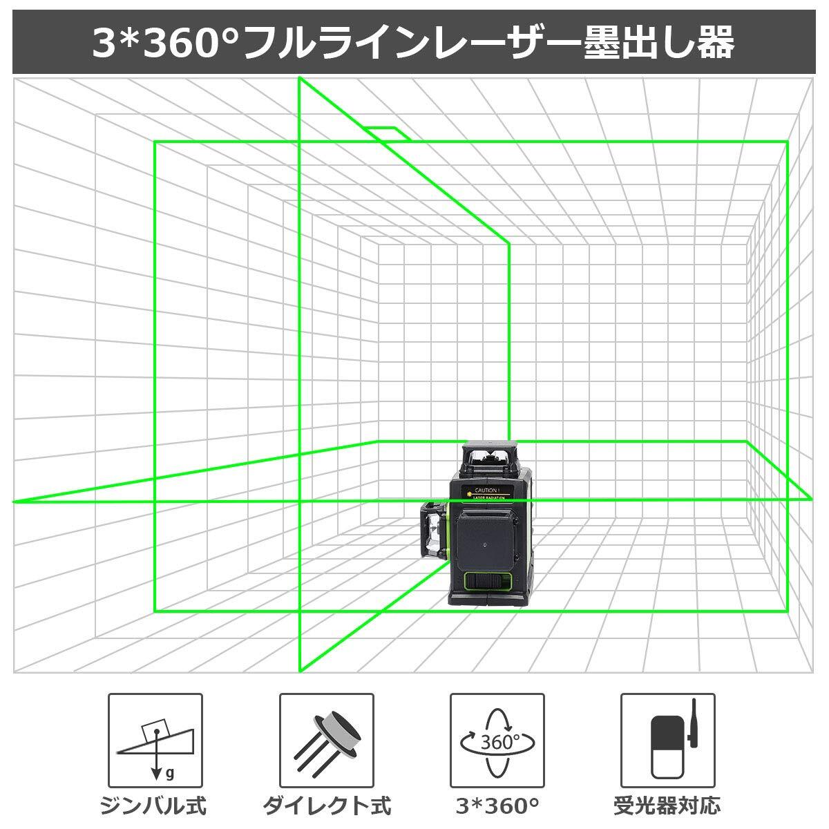 Huepar 3x360° レーザー墨出し器 グリーン 緑色 レーザー クロスライン 大矩 フルライン照射モデル 自動補正 2電源方式 USB充電可能 受光器対応 GF360G
