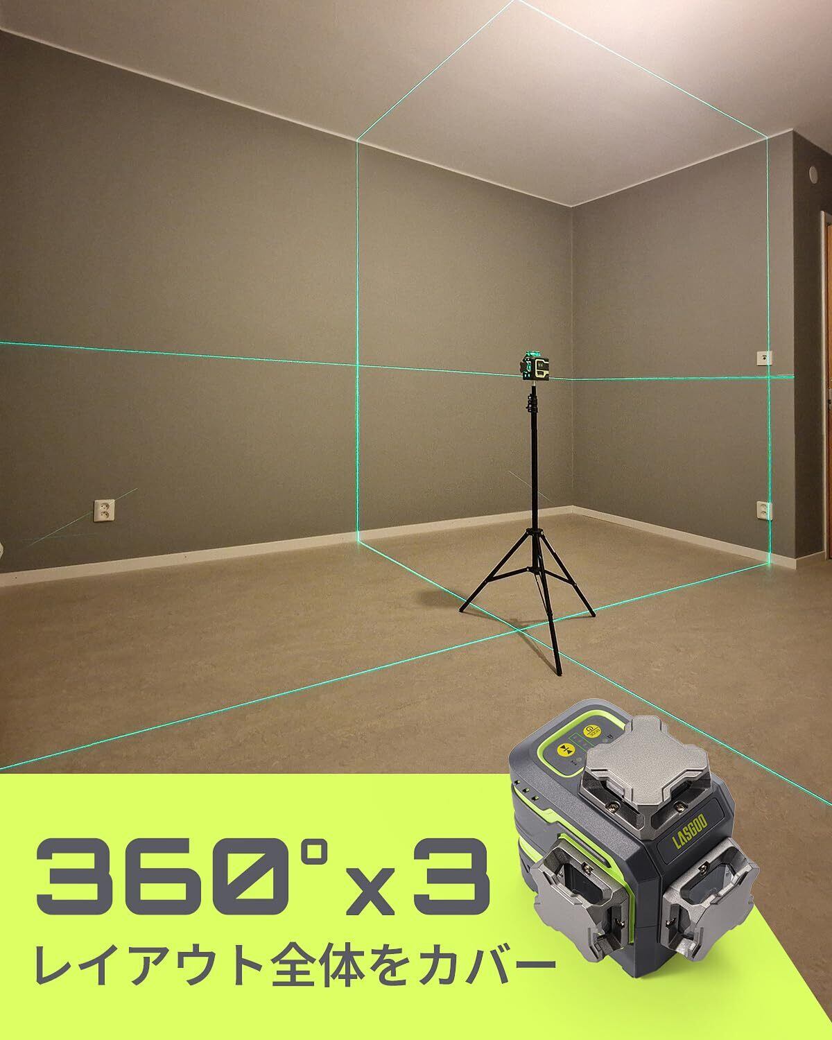 【特価セール】LasGoo LG-3DM グリーンビームレーザー水準器、セルフレベリング3x360°クロスラインレーザー、建築・絵画吊り下げ用、5200mAh内蔵充電式バッテリー、Type-Cケーブル、マグネット式回転スタンド付属