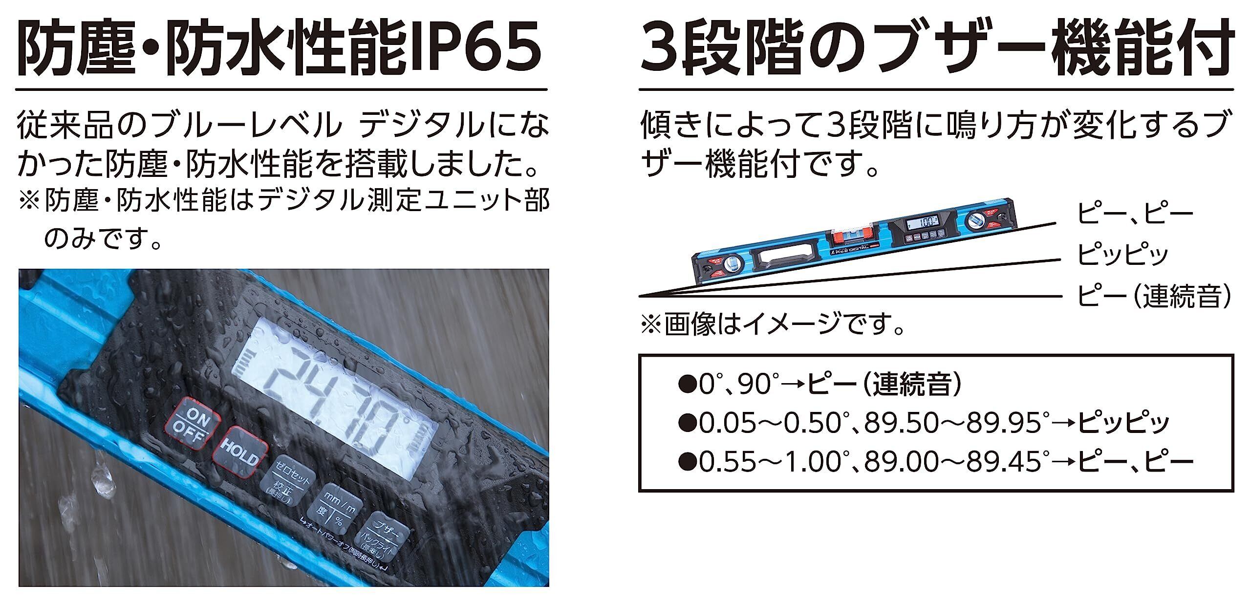 ●防塵・防水のデジタル水平器です。●3段階のブザー機能付き。●水平気泡管カバー付。●デジタル測定は、立ち上がりと角度、勾配を測定できます。●強力マグネット付です。